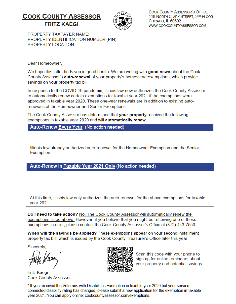 The blue auto-renewal letter verifies and lists the exemptions that will automatically renew this year. In response to the COVID-19 pandemic, the Assessor's Office is automatically renewing certian exemptions for tax year 2021 if the exemptions were approved in tax year 2020. If you received this letter, the exemptions listed will automatically renew and no action is required.