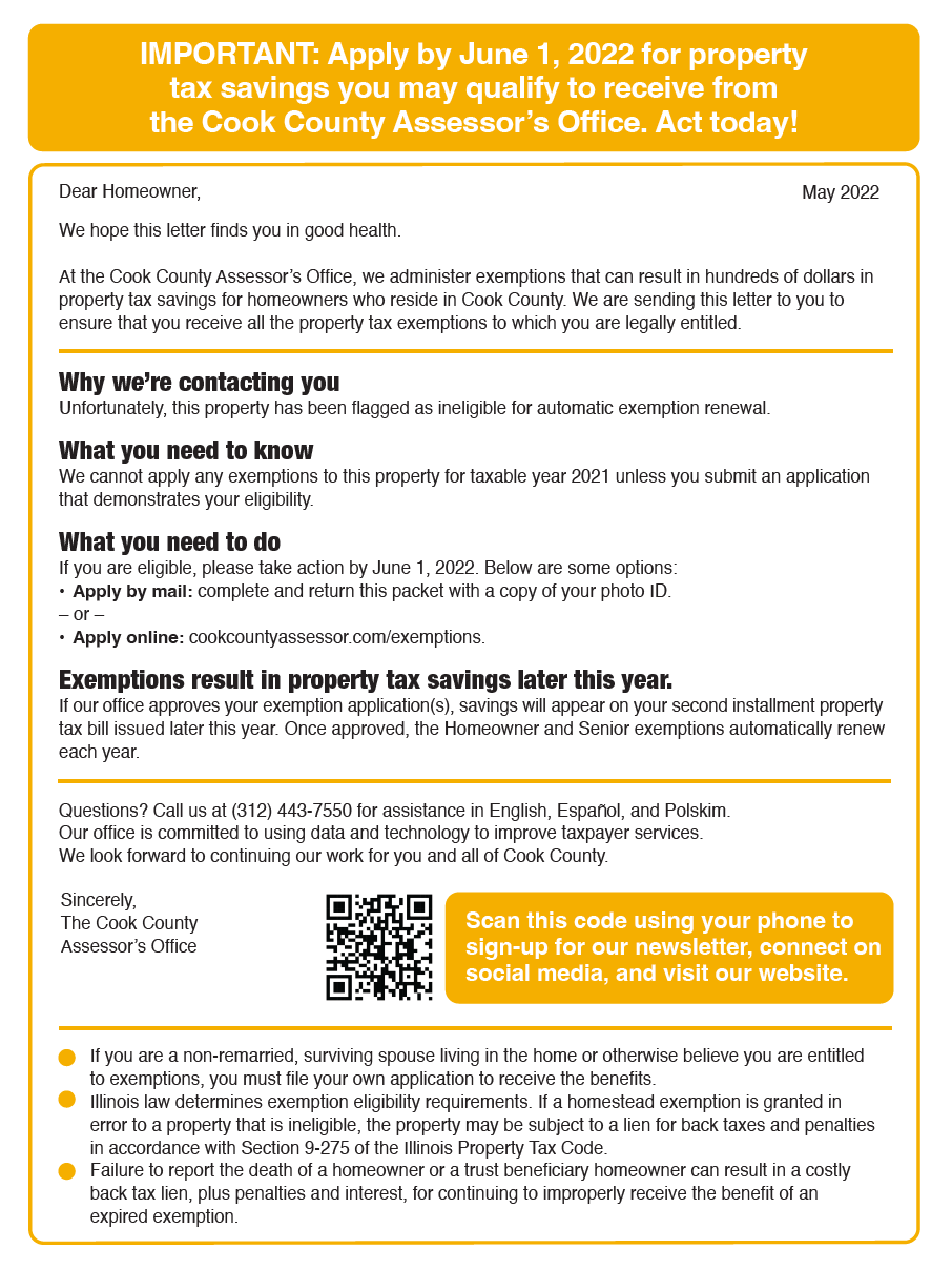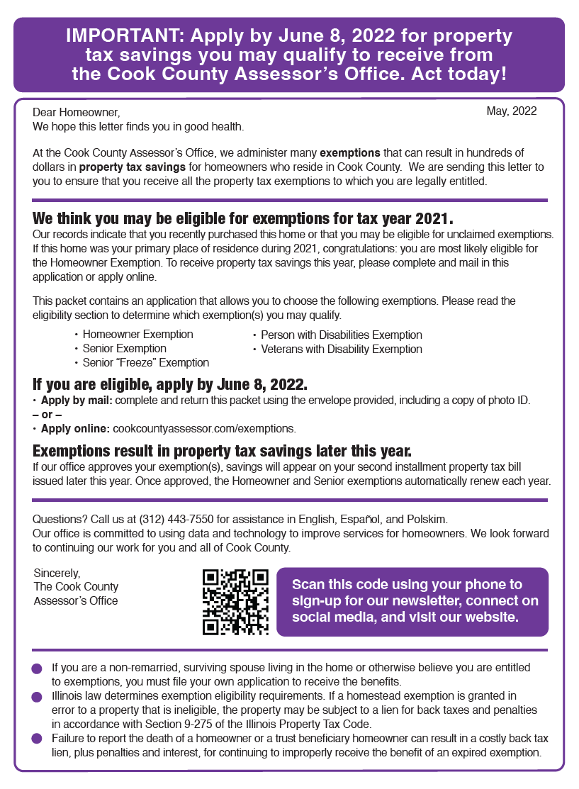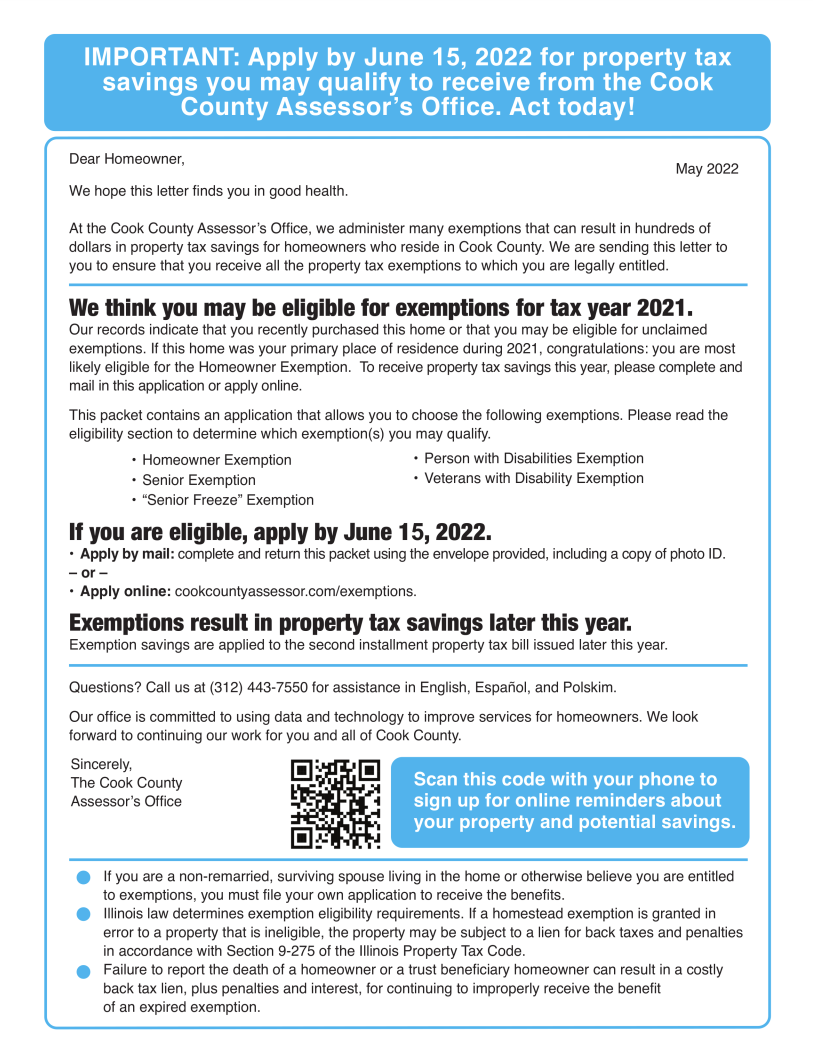 Every year the Assessor's Office sends mail to households regarding property tax exemptions. Most recently booklets were sent to over 100,000 households that need to either reapply for exemptions or may be eligible to receive savings. Here is a simple reference guide to help homeowners understand the mail from our office.