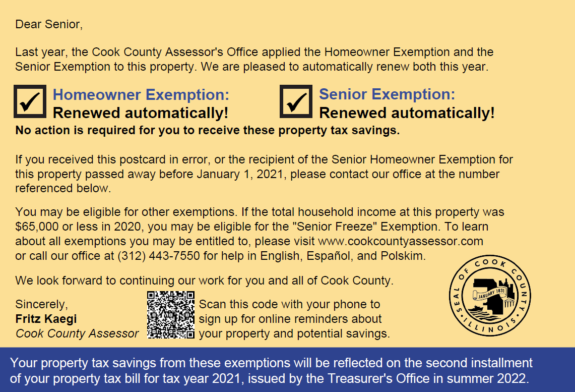 The yellow postcard verifies that the Homeowner and Senior Exemption will automatically renew this year. No action is required by the homeowner. If you received this postcard in error or if the recipient of the Senior Exemption passed away prior to January 1, 2021, please contact our office.