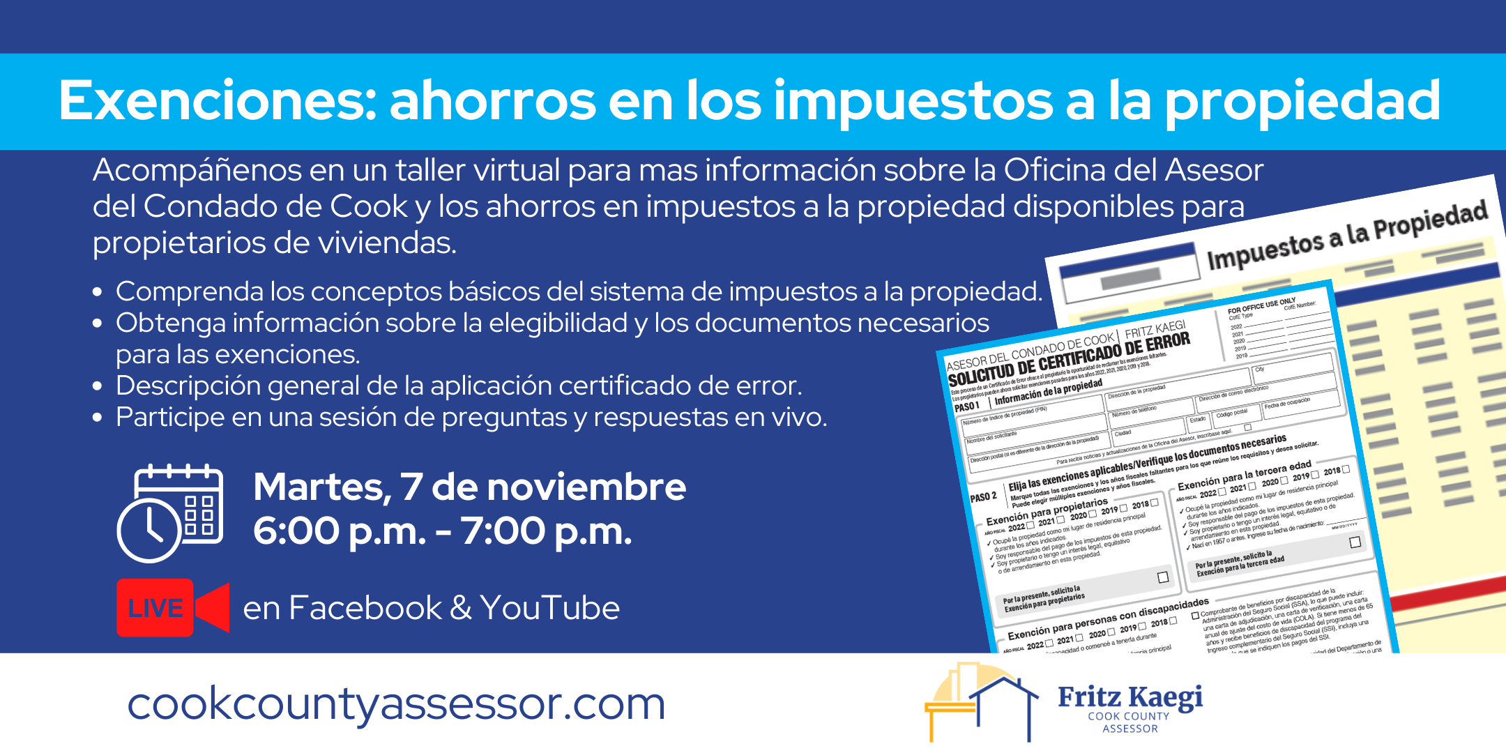 Acompáñenos en un taller virtual para mas información sobre la Oficina del Asesor del Condado de Cook y los ahorros en impuestos a la propiedad disponibles para propietarios de viviendas.