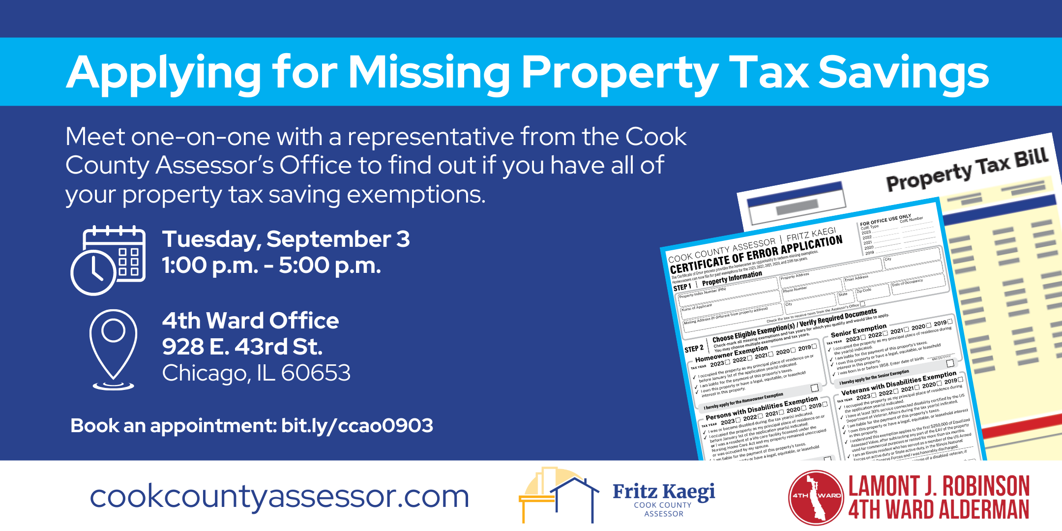 Meet one on one with a representative from the Cook County Assessor's Office to find out if you have all of your property tax saving exemptions.