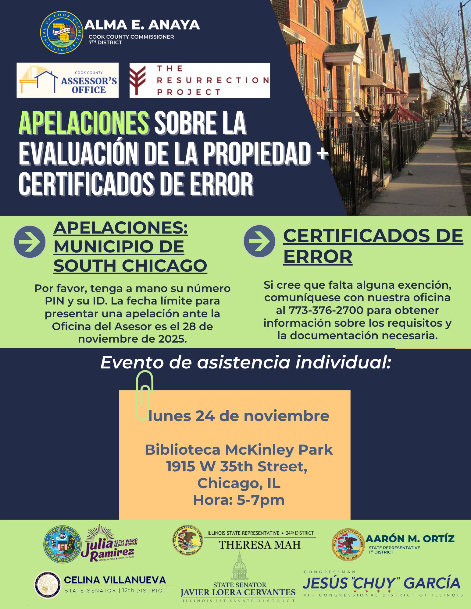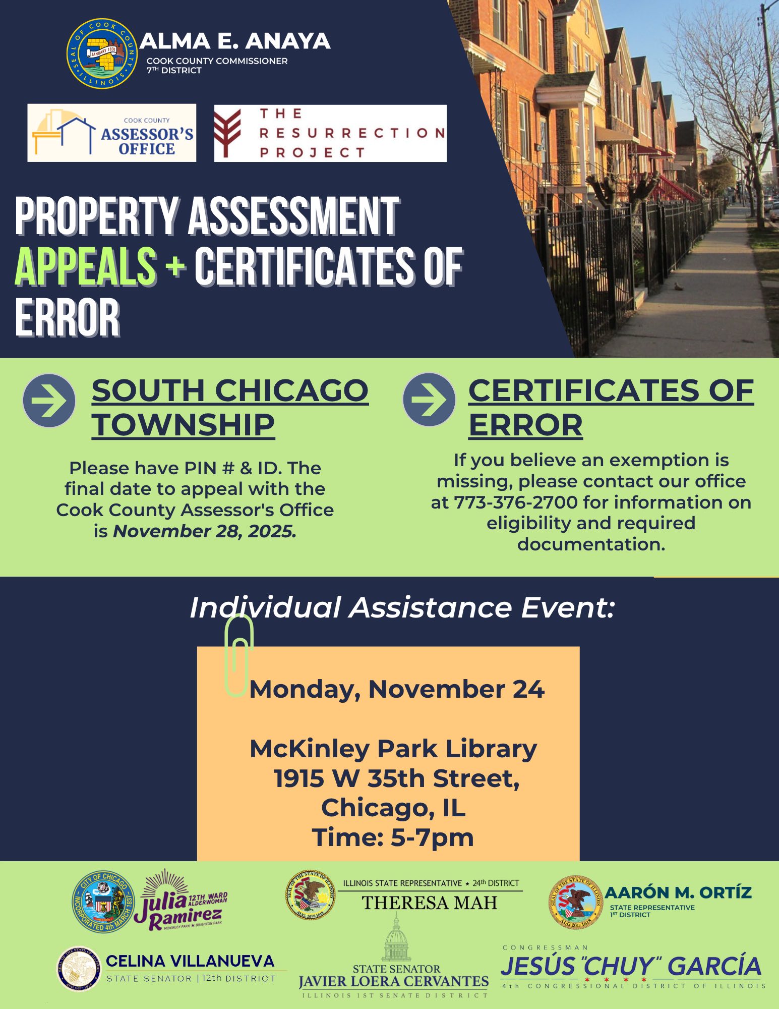 Meet one-on-one with a representative from the Cook County Assessor’s Office to find out if you have all of your property tax saving exemptions.