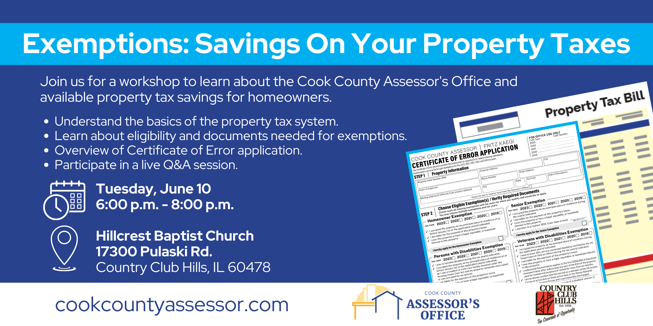 Join us for a workshop to learn about the Cook County Assessor's Office and available property tax savings for homeowners.