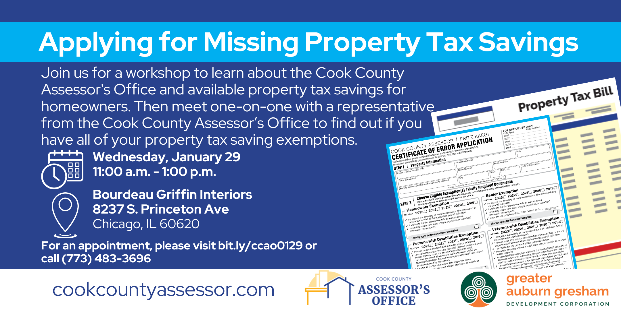 Join us for a workshop to learn about the Cook County Assessor's Office and available property tax savings for homeowners. Then meet one-on-one with a representative from the Cook County Assessor's Office to find out if you have all of your property tax saving exemptions.