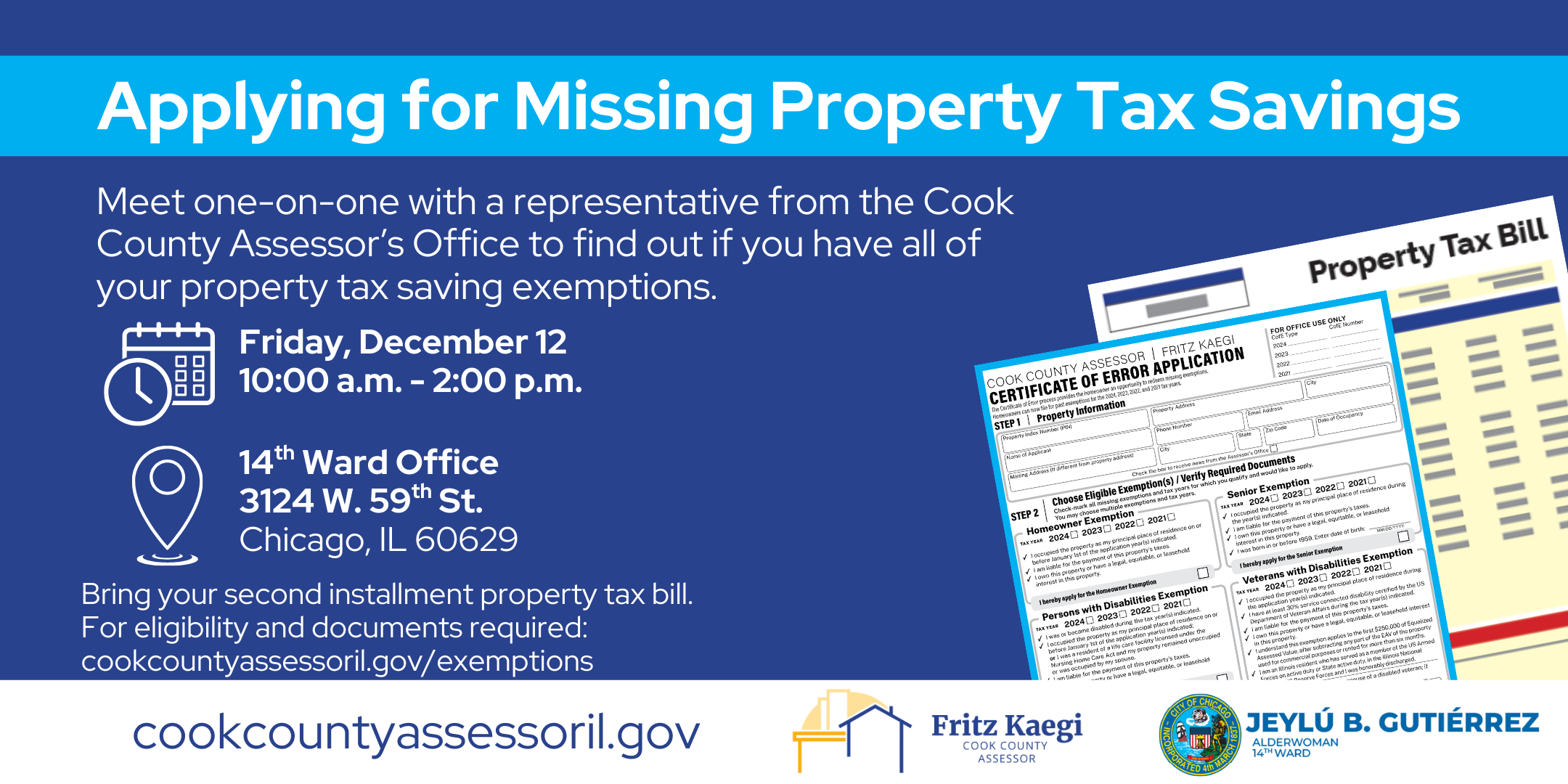 Meet one-on-one with a representative from the Cook County Assessor’s Office to find out if you have all of your property tax saving exemptions.