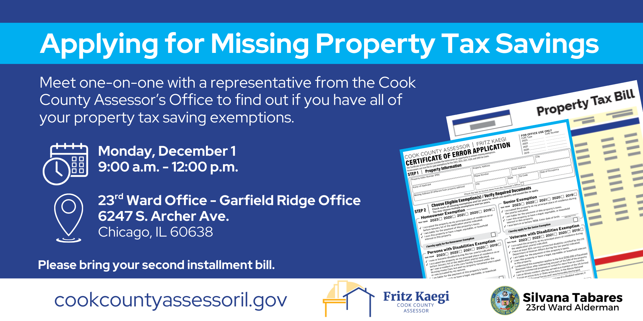 Meet one-on-one with a representative from the Cook County Assessor’s Office to find out if you have all of your property tax saving exemptions.