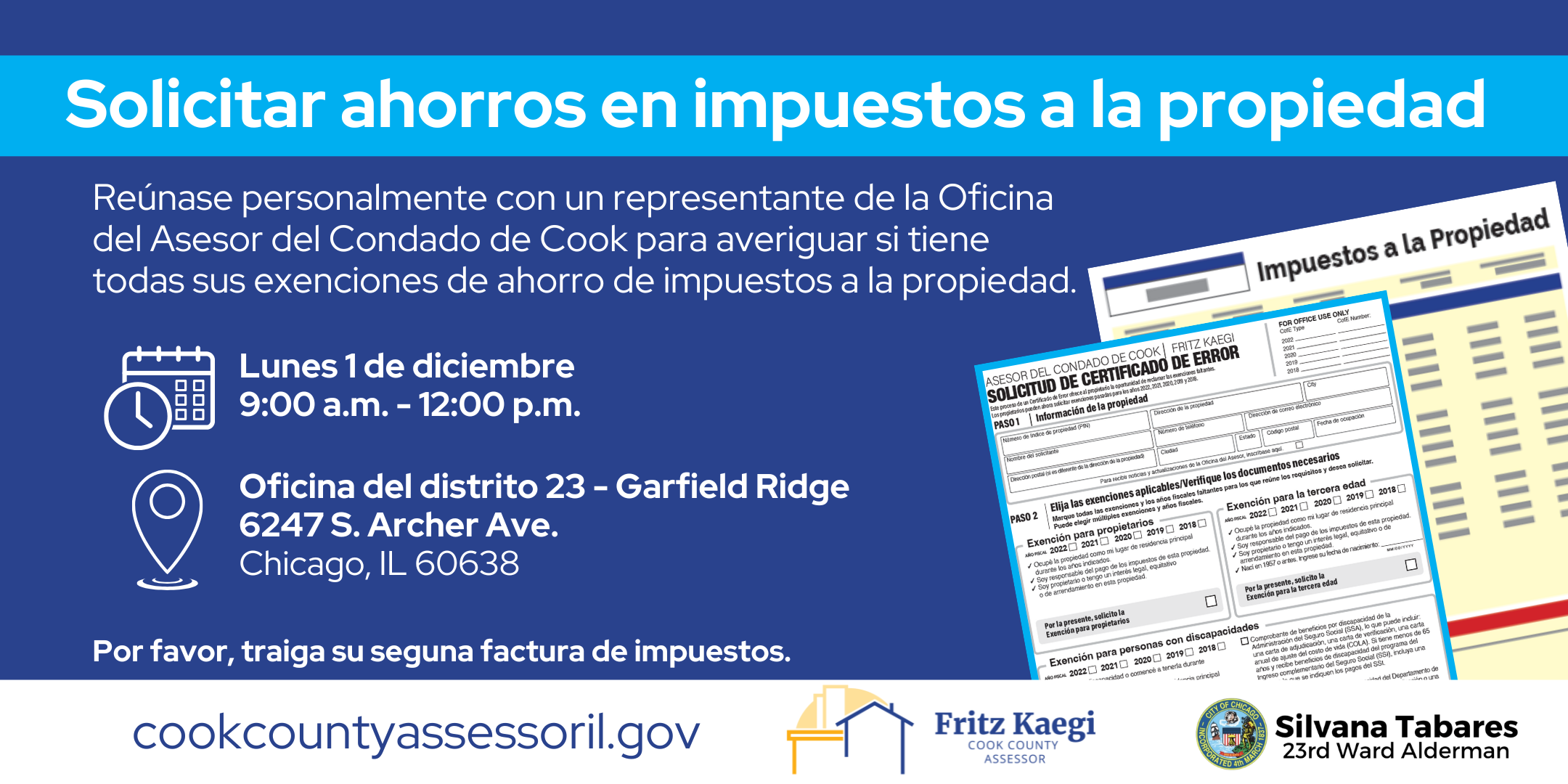 Reúnase personalmente con un representante de la Oficina del Asesor del Condado de Cook para averiguar si tiene todas sus exenciones de ahorro de impuestos a la propiedad.