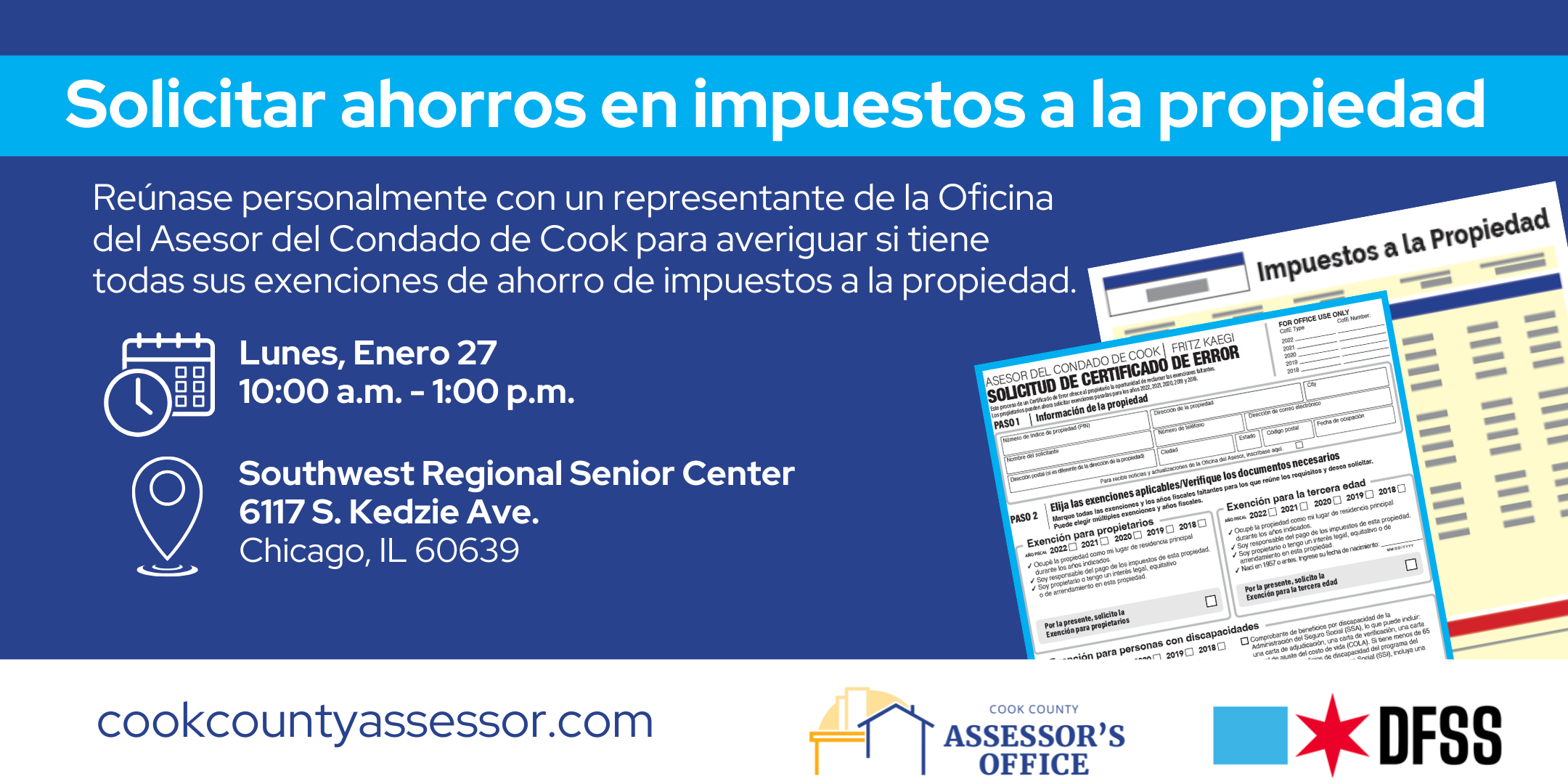 Reúnase personalmente con un representante de la Oficina del Asesor del Condado de Cook para averiguar si tiene todas sus exenciones de ahorro de impuestos a la propiedad.