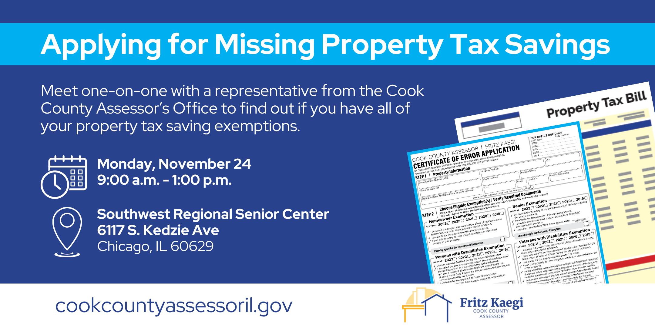 Meet one-on-one with a representative from the Cook County Assessor’s Office to find out if you have all of your property tax saving exemptions.