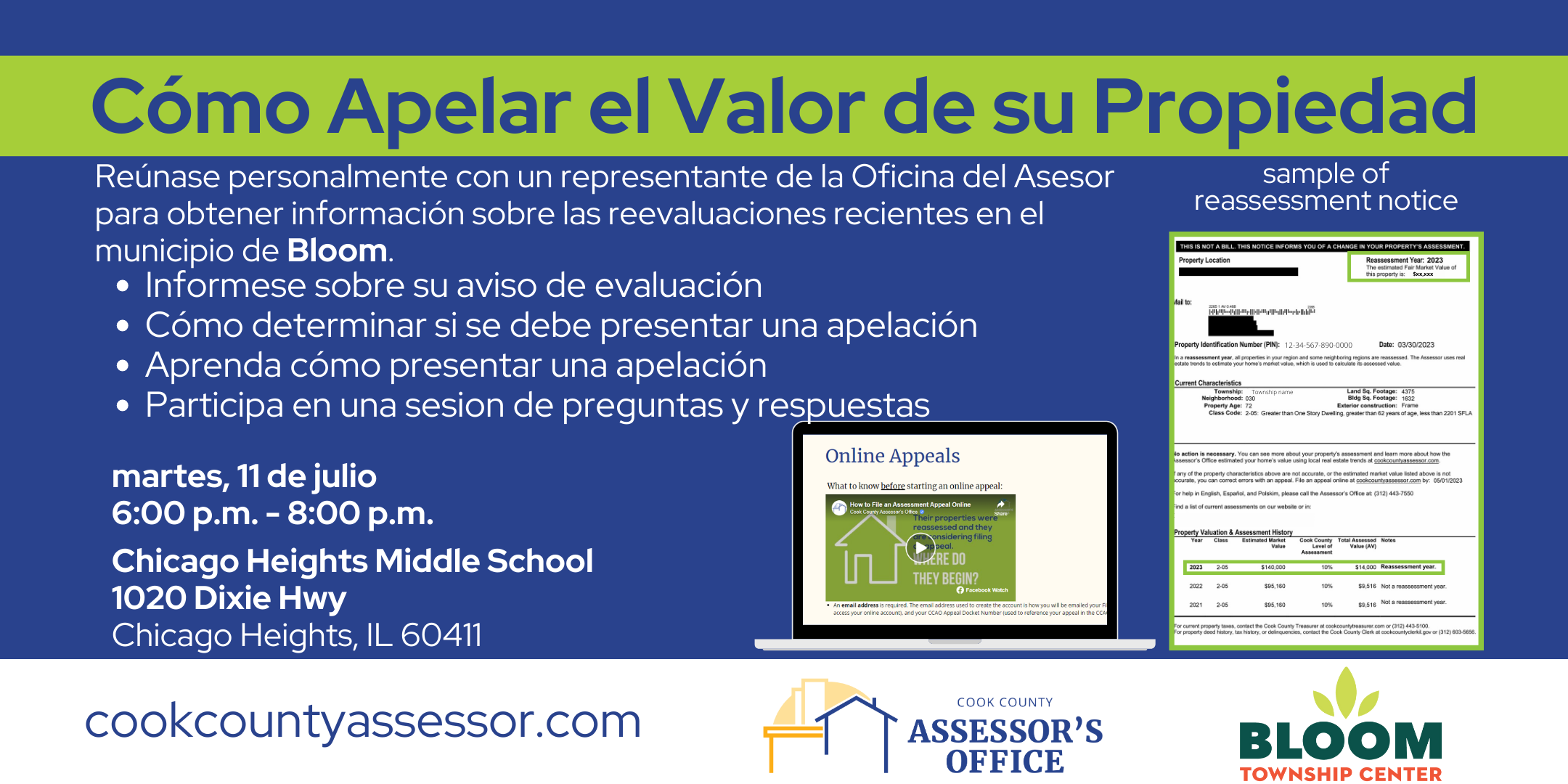 Reúnase personalmente con un representante de la Oficina del Asesor para obtener información sobre las reevaluaciones recientes en el municipio de Bloom.