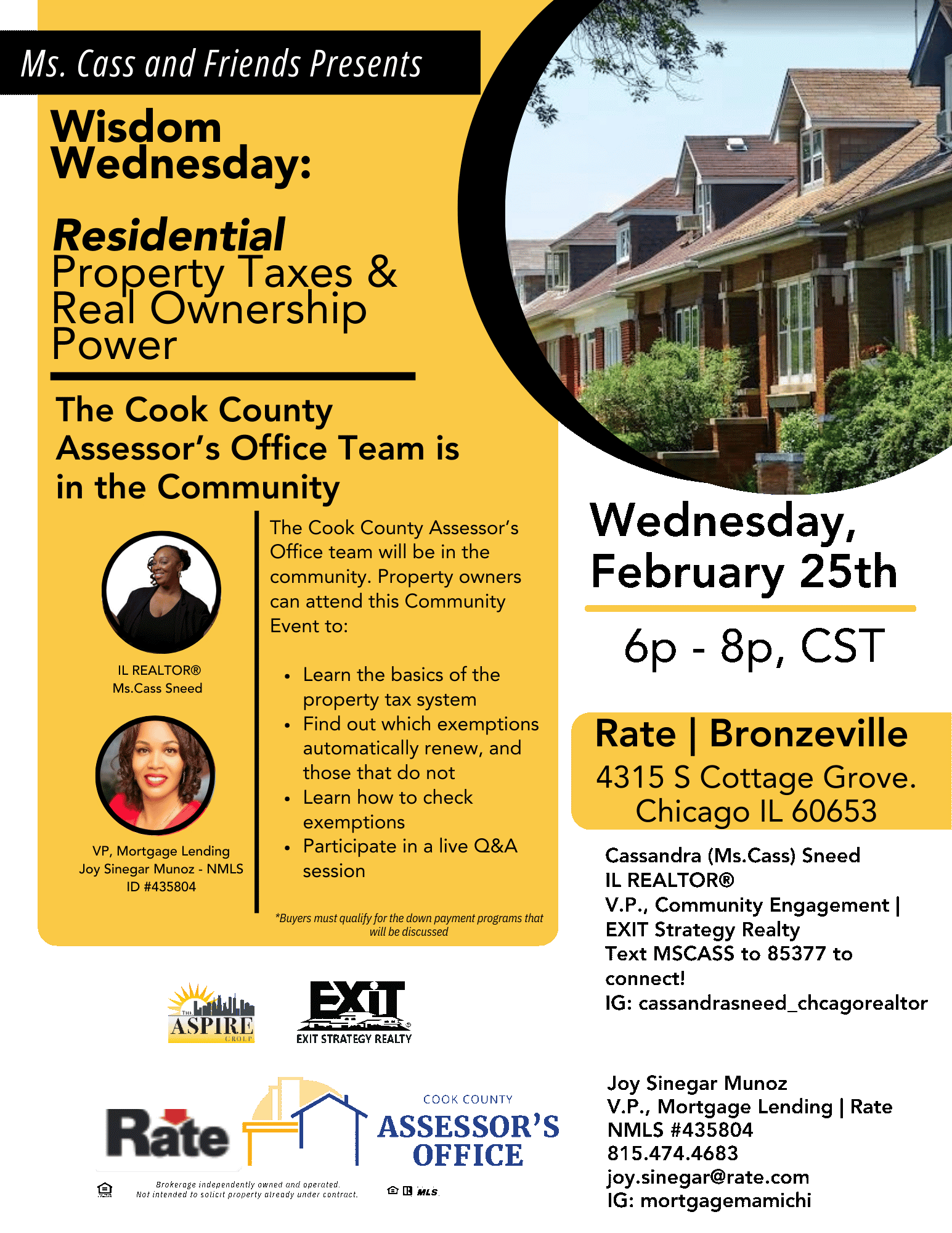 The Cook County Assessor's Office team will be in the community. Property owners can attend this Community Event to: