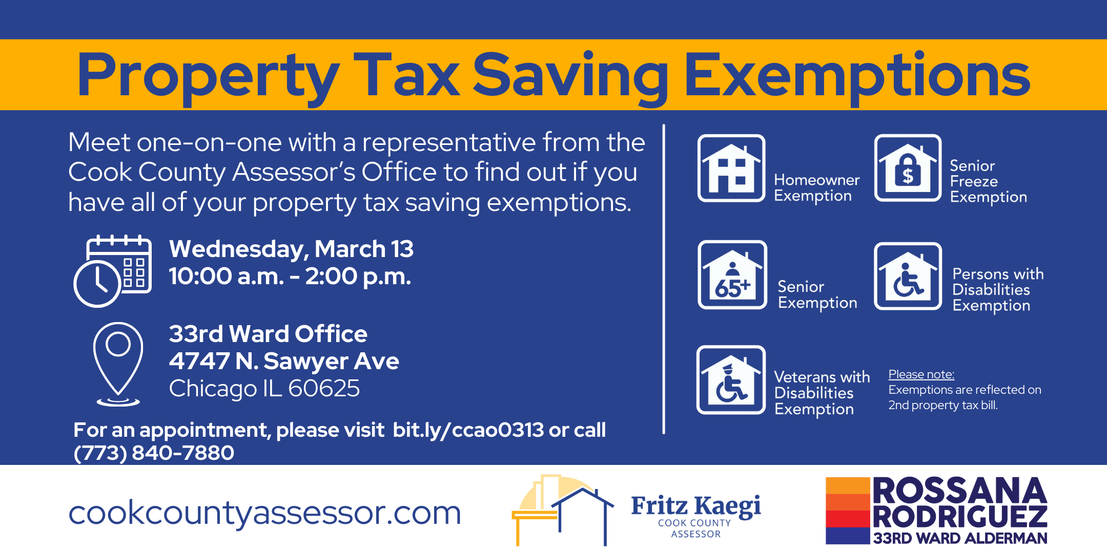Meet on-on-one with a representative from the Cook County Assessor's Office to find out if you have all of your property tax saving exemptions.
