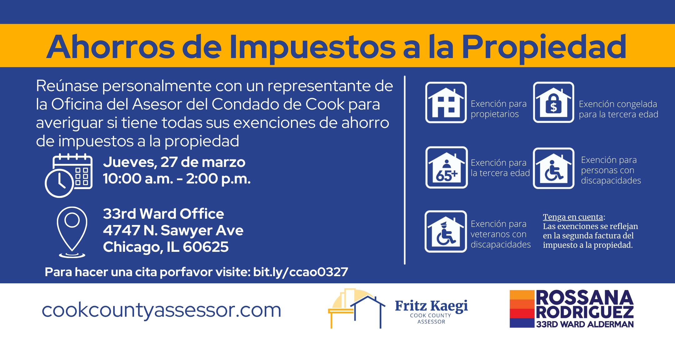 Reúnase personalmente con un representante de la Oficina del Asesor del Condado de Cook para averiguar si tiene todas sus exenciones de ahorro de impuestos a la propiedad.
