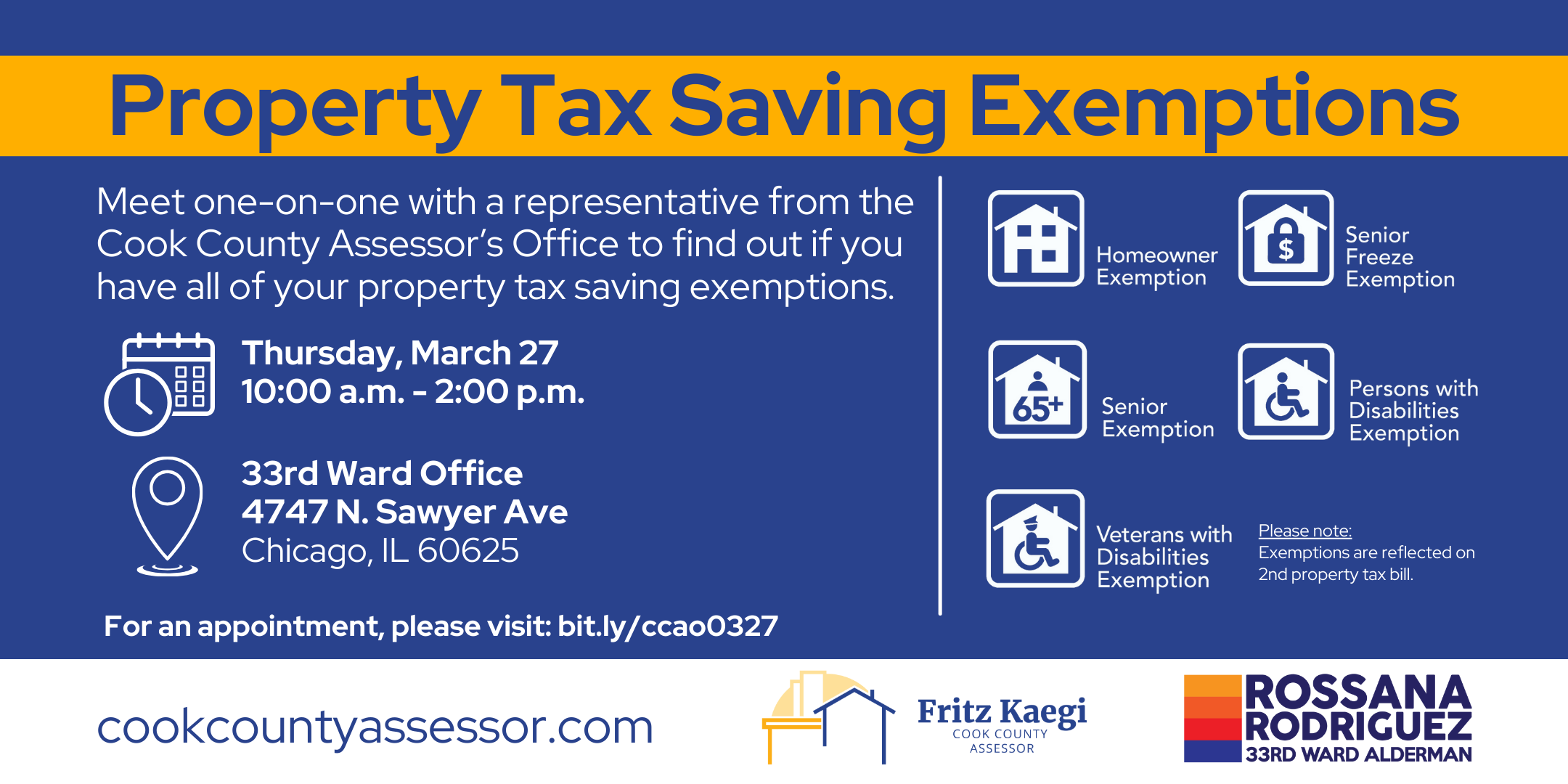 Meet one-on-one with a representative from the Cook County Assessor’s Office to find out if you have all of your property tax saving exemptions.