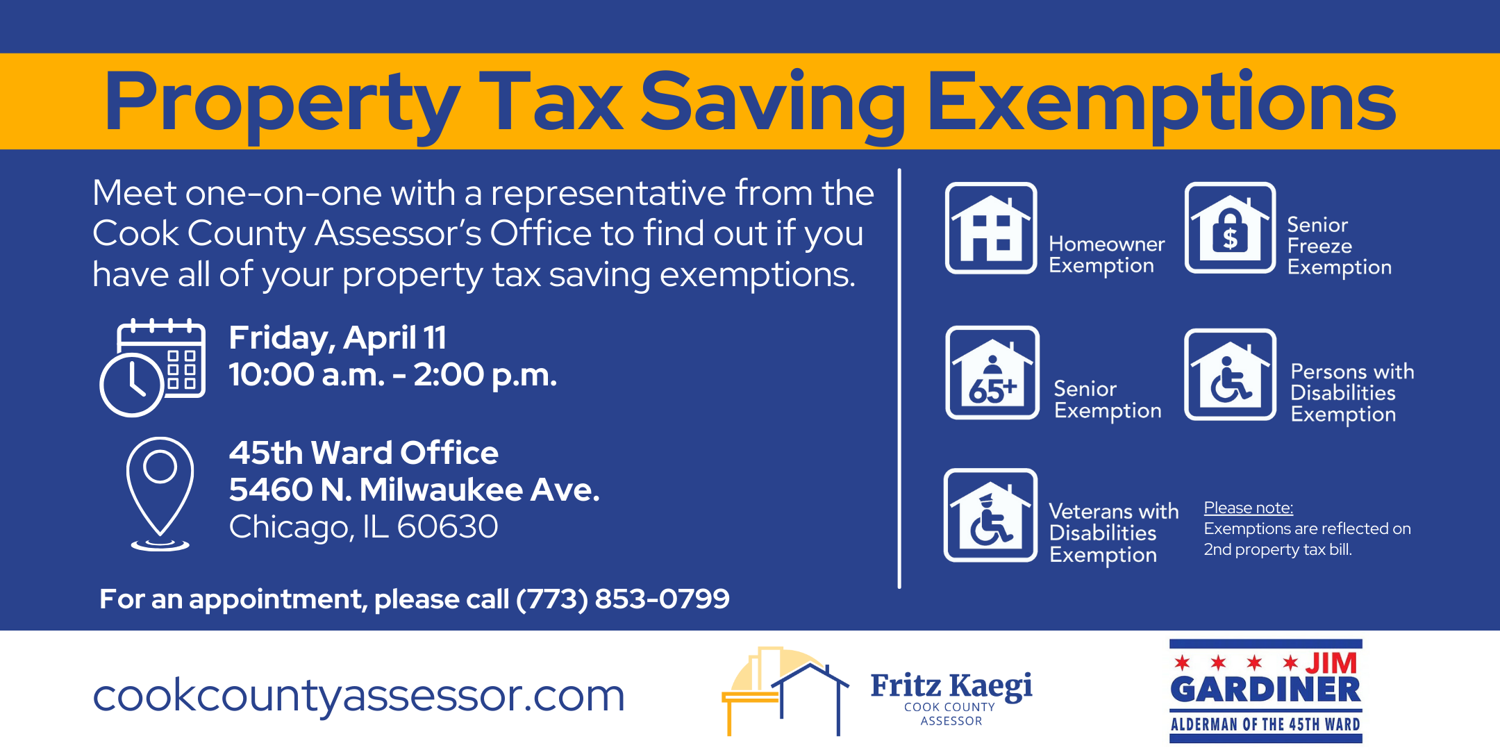 Meet one-on-one with a representative from the Cook County Assessor’s Office to find out if you have all of your property tax saving exemptions.