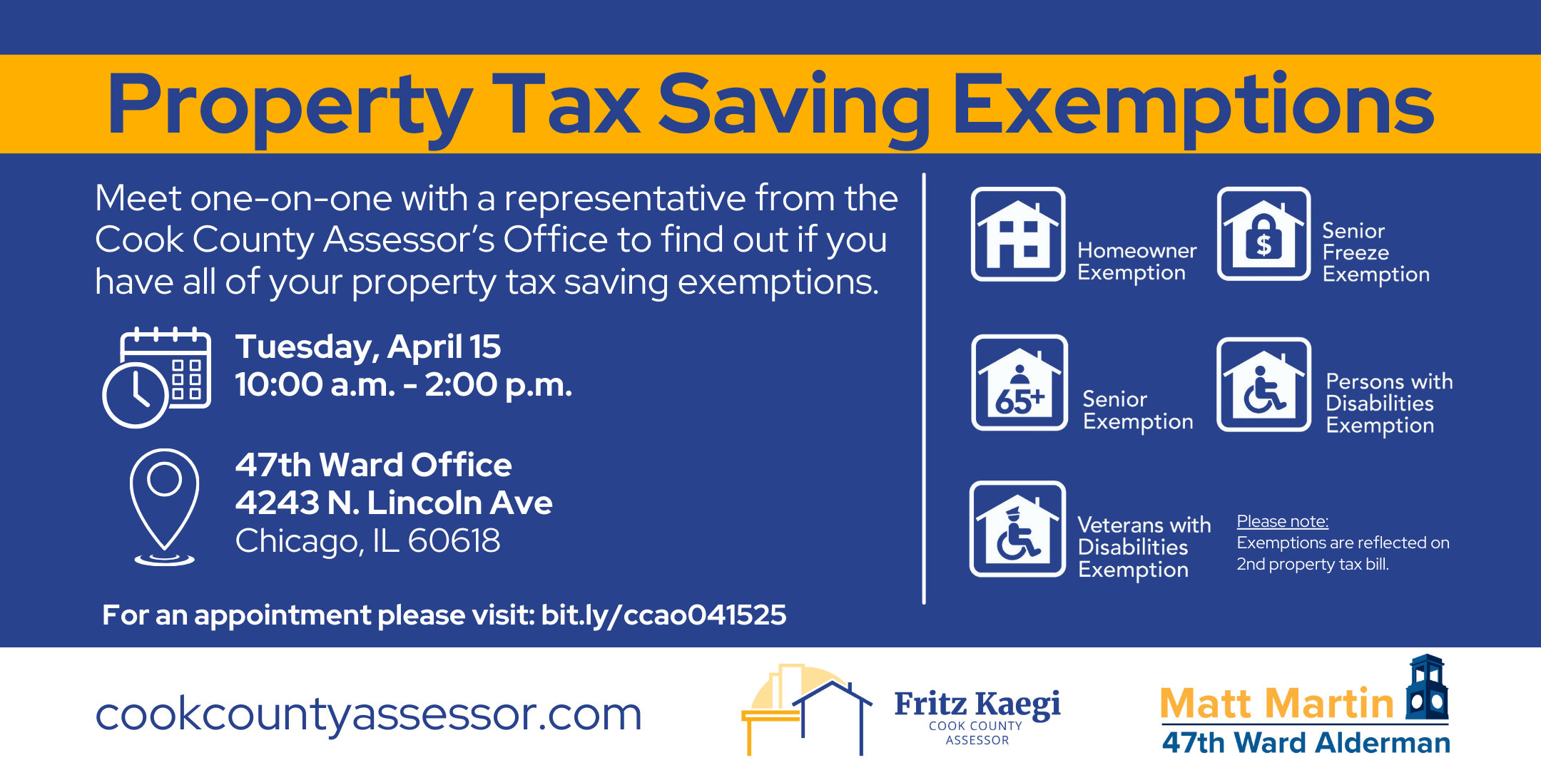 Meet one-on-one with a representative from the Cook County Assessor’s Office to find out if you have all of your property tax saving exemptions.S