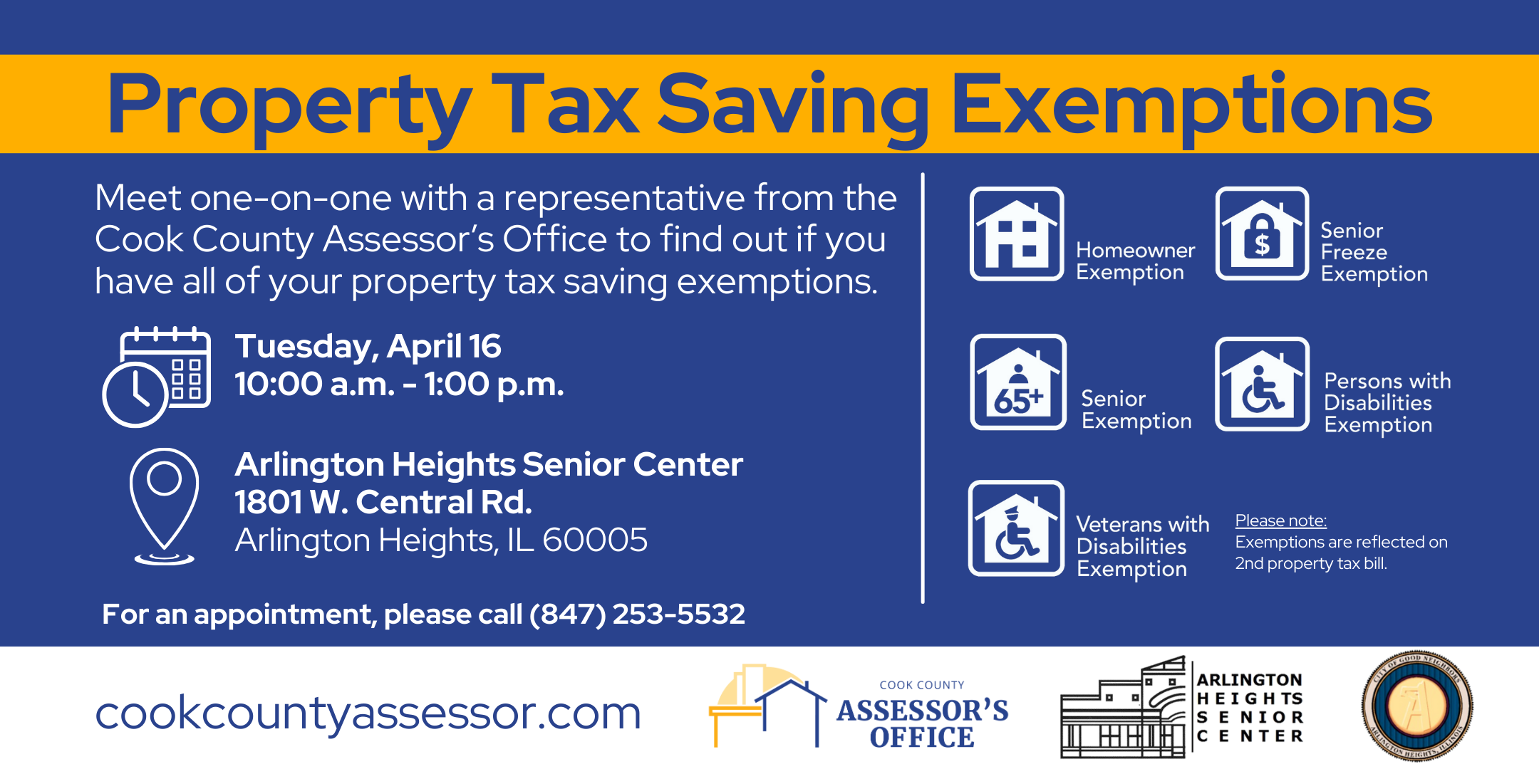 Meet one-on-one with a representative from the Cook County Assessor's Office to find out if you have all of your property tax saving exemptions.