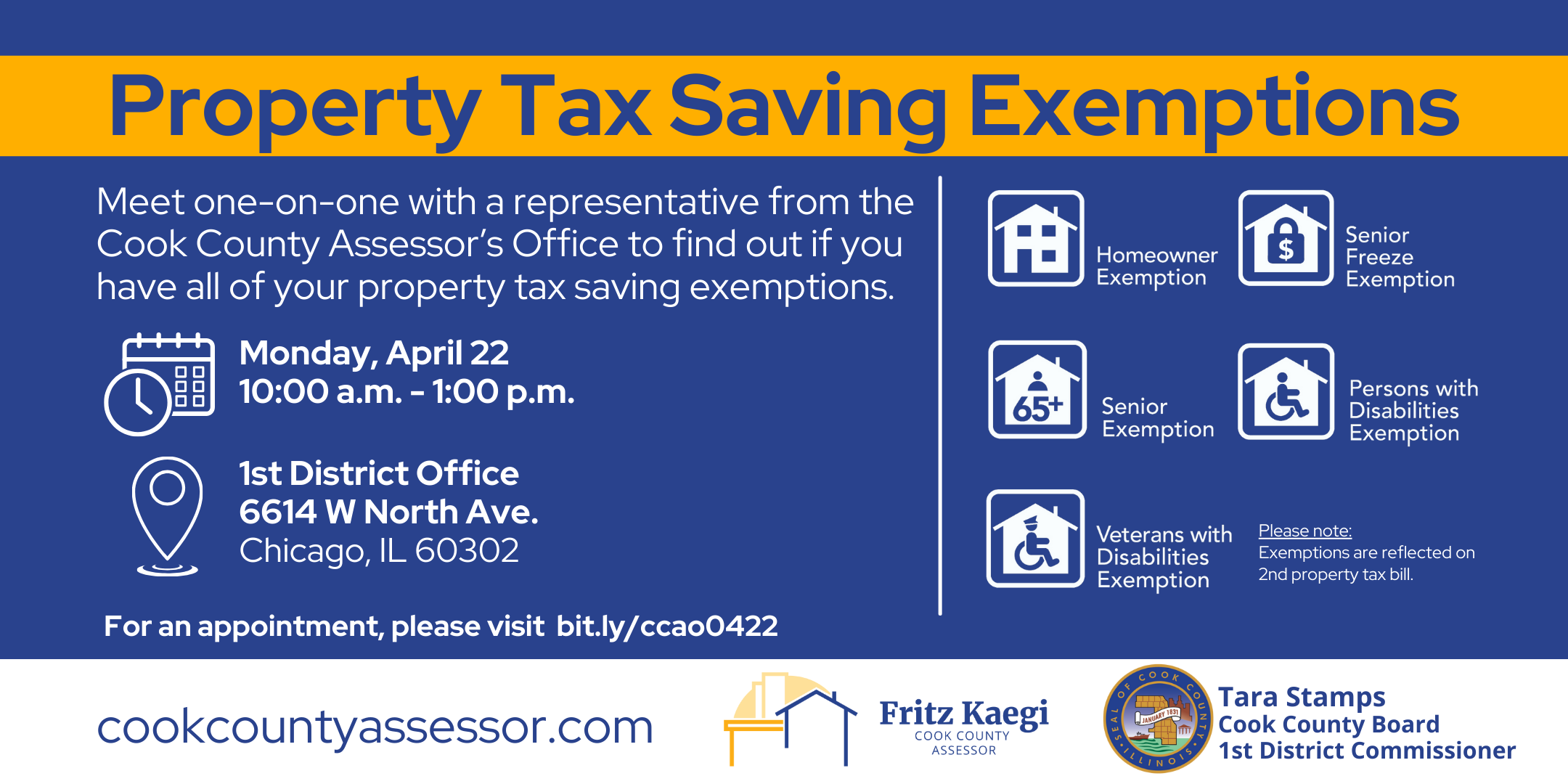 Meet one-on-one with a representative from the Cook County Assessor's Office to find out if you have all of your property tax saving exemptions.
