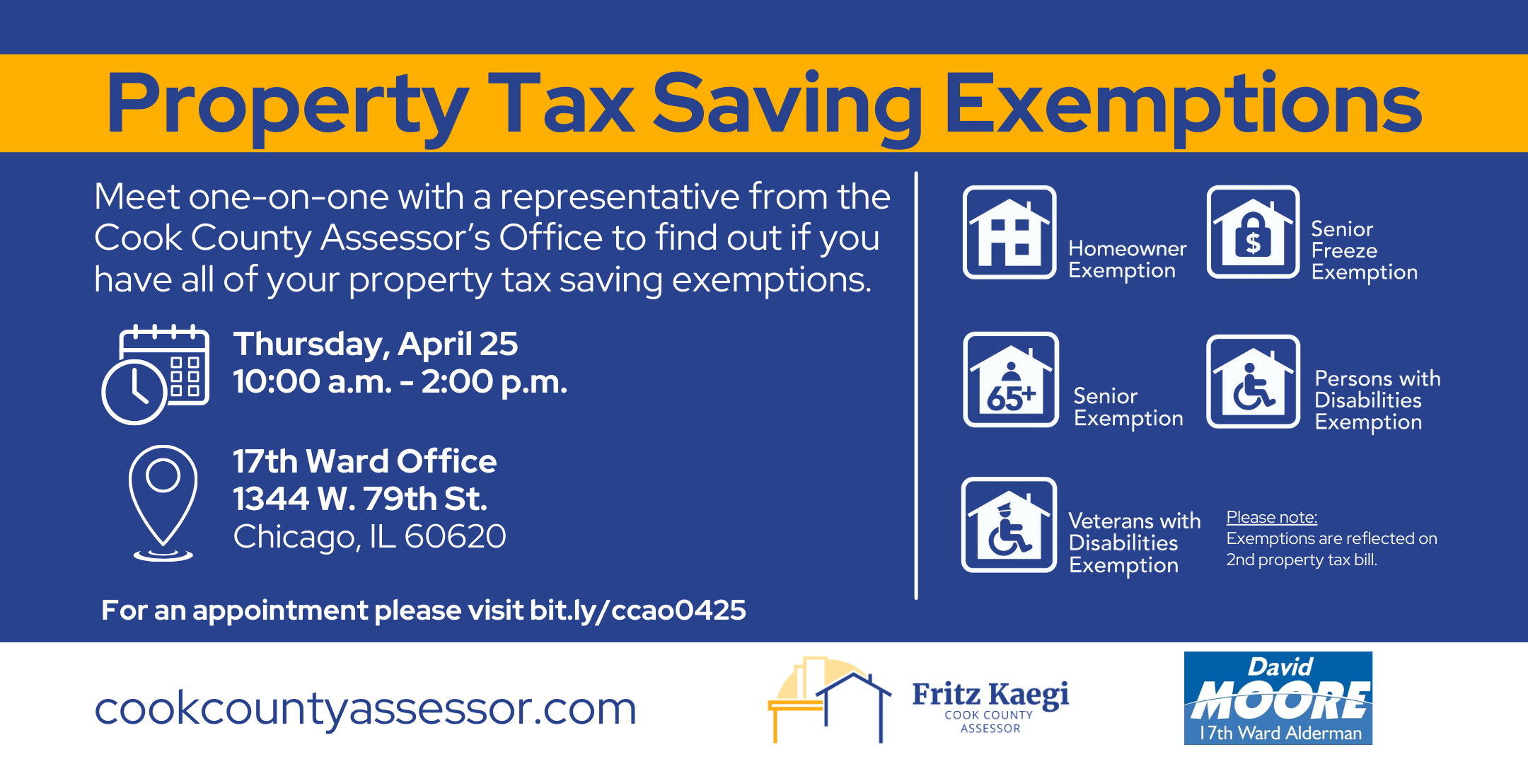 Meet one-on-one with a representative from the Cook County Assessor's Office to find out if you have all of your property tax saving exemptions.