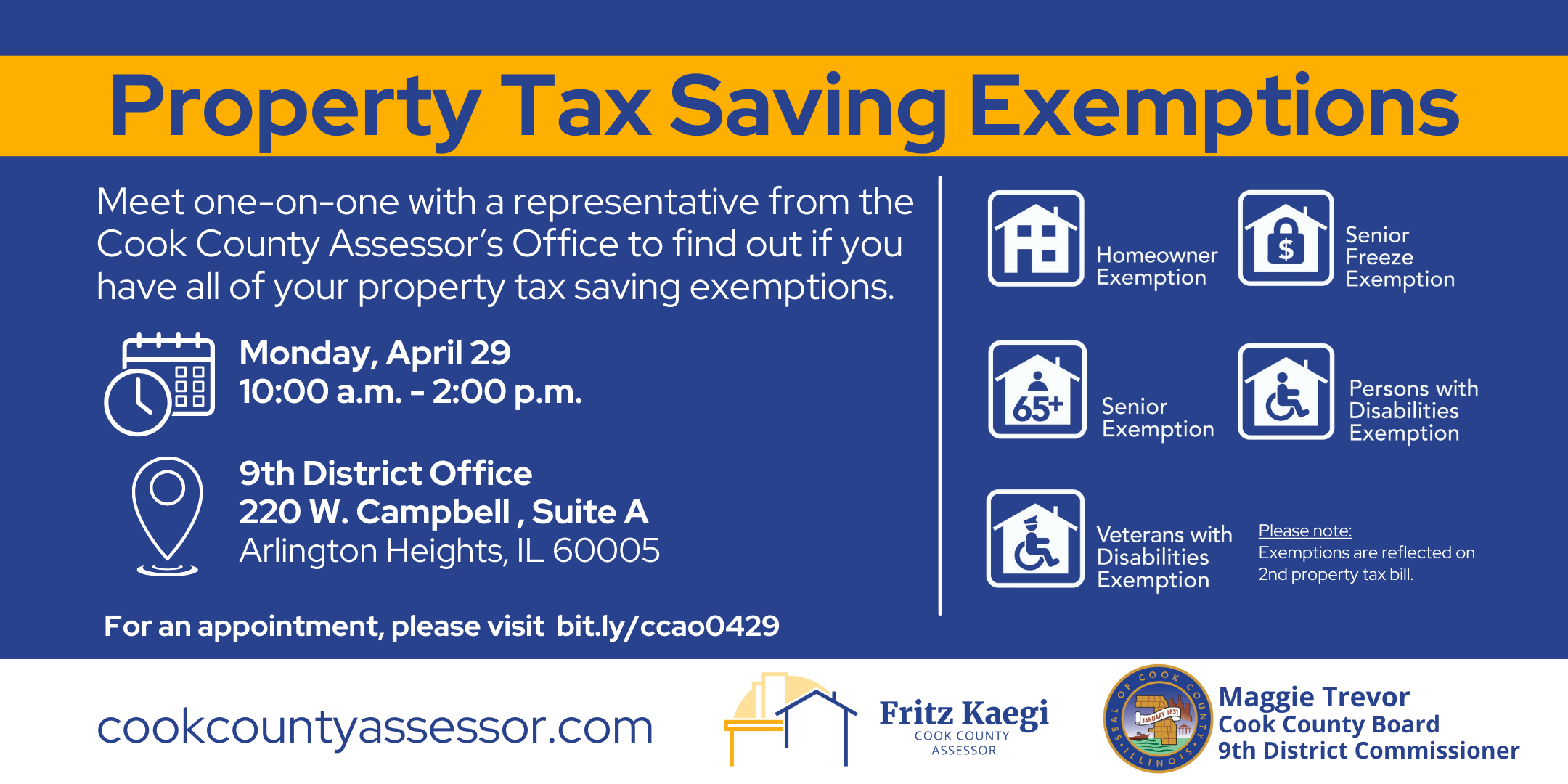 Meet one-on-one with a representative from the Cook County Assessor's Office to find out if you have all of your property tax saving exemptions.