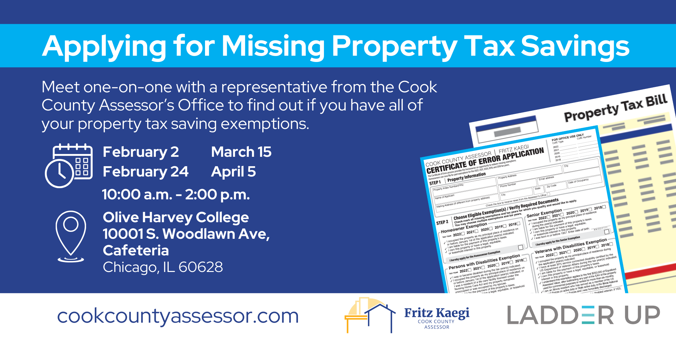 Meet one-on-one with a representative from the Cook County Assessor's Office to find out if you have all of your property tax-saving exemptions.