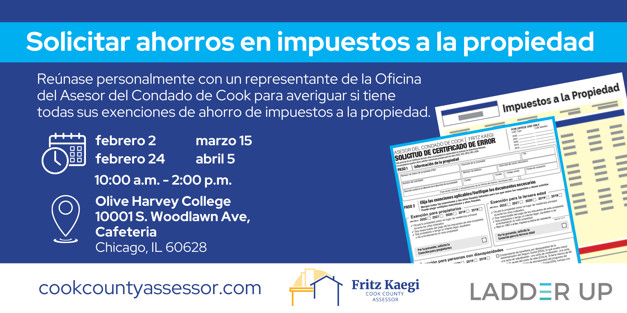 Reúnase personalmente con un representante de la Oficina del Asesor del Condado de Cook paraaveriguar si tiene todas sus exenciones de ahorro de impuestos a la propiedad.