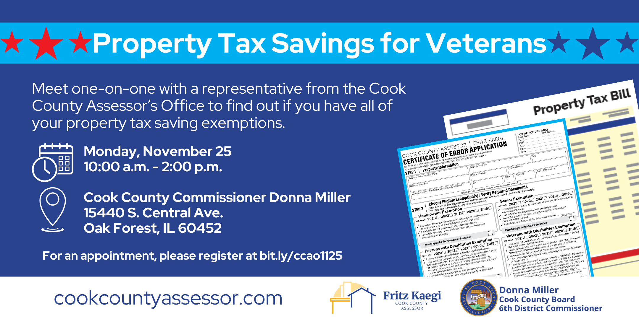 Meet one-on-one with a representative from the Cook County Assessor's Office to find out if you have all of your property tax saving exemptions.