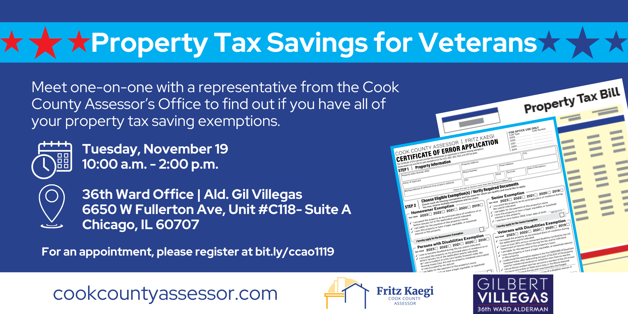 Meet one-on-one with a representative from the Cook County Assessor's Office to find out if you have all of your property tax saving exemptions.