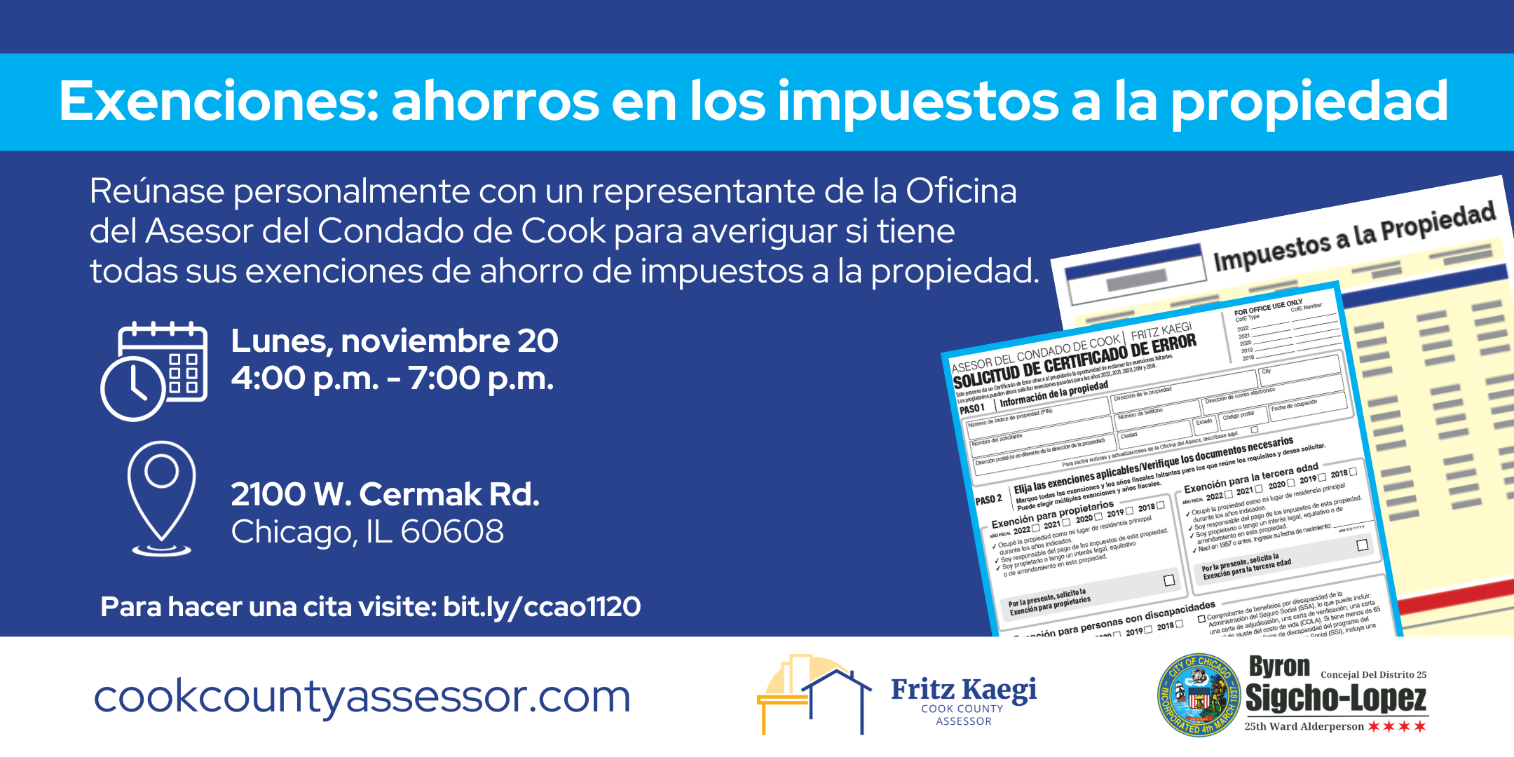Reúnase personalment con un representante de la Oficina del Asesor del Condado de Cook para averiguar si tiene todas sus exencsiones de ahoor de impuestos a la propiedad.