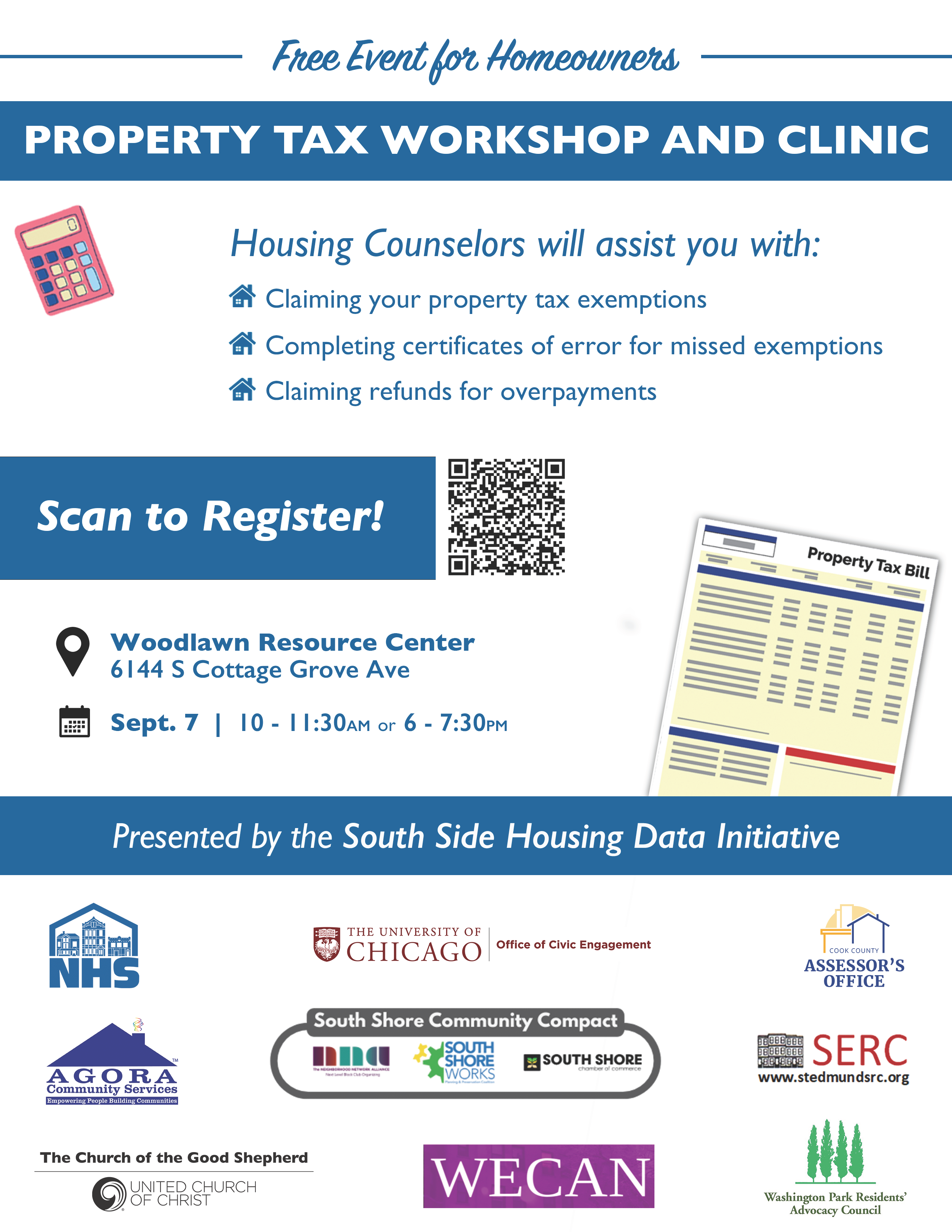 Join us for a workshop to learn more about property tax savings offered by the Cook County Assessor's Office. Then join us for individual assistance to help find missing exemptions.