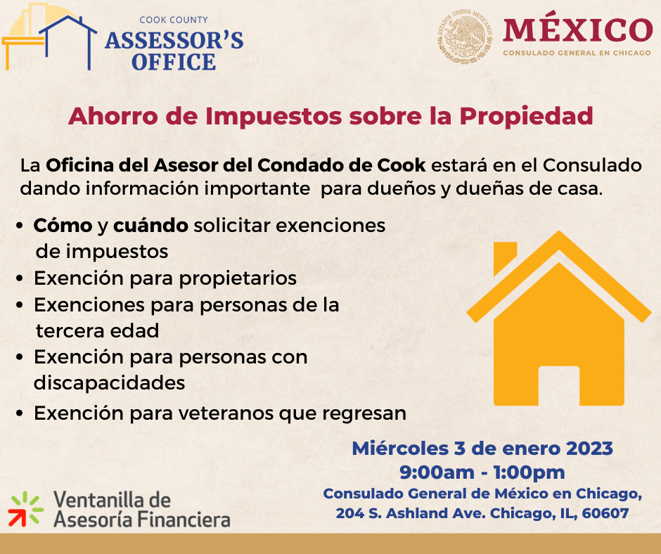 La Oficina del Asesor del Condado de Cook estará en el Consulado dando información importante para dueños y dueñas de casa.