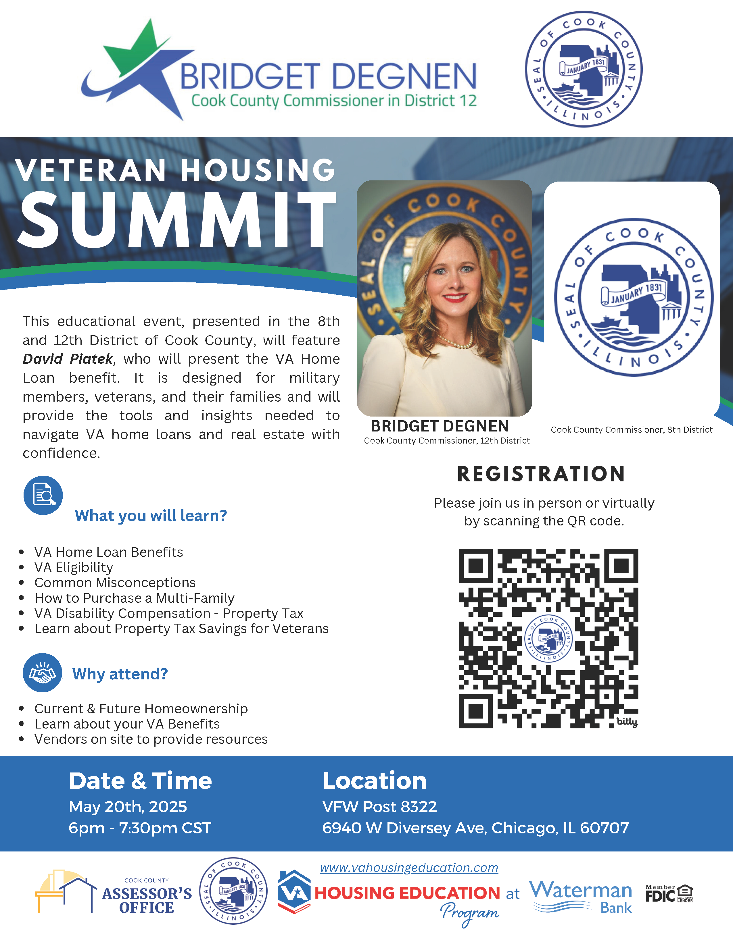 Please stop by our table at the Veteran Housing Summit to learn more about the Cook County Assessor's Office and available property tax saving exemptions for veterans!