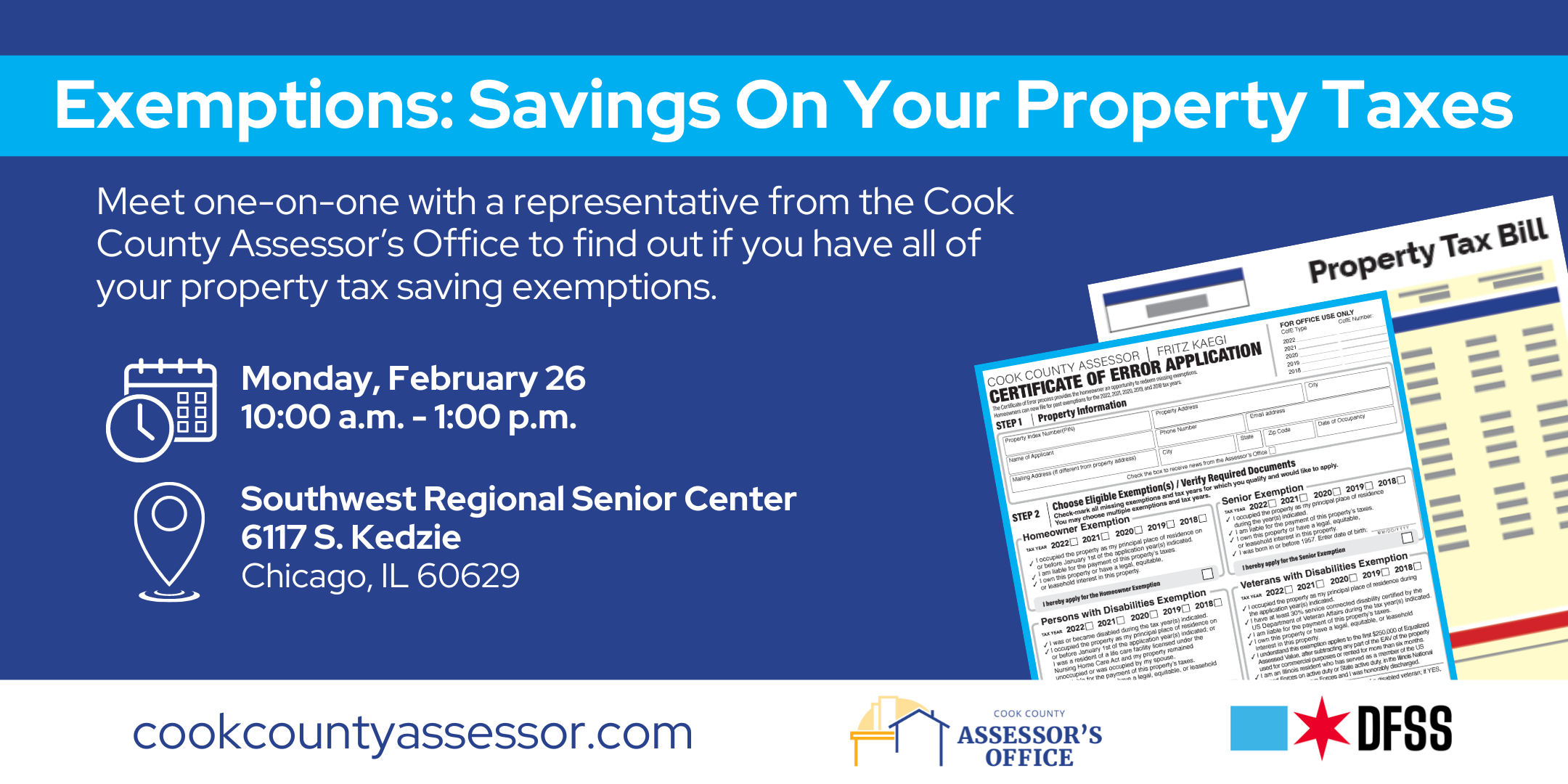 Meet one-on-one with a representative from the Cook County Assessor's Office to find out if you have all of your property tax saving exemptions.