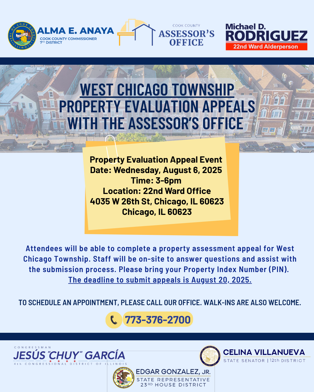 Meet one-on-one with a representative from the Assessor's Office to learn about the appeal process in West Chicago Township.
