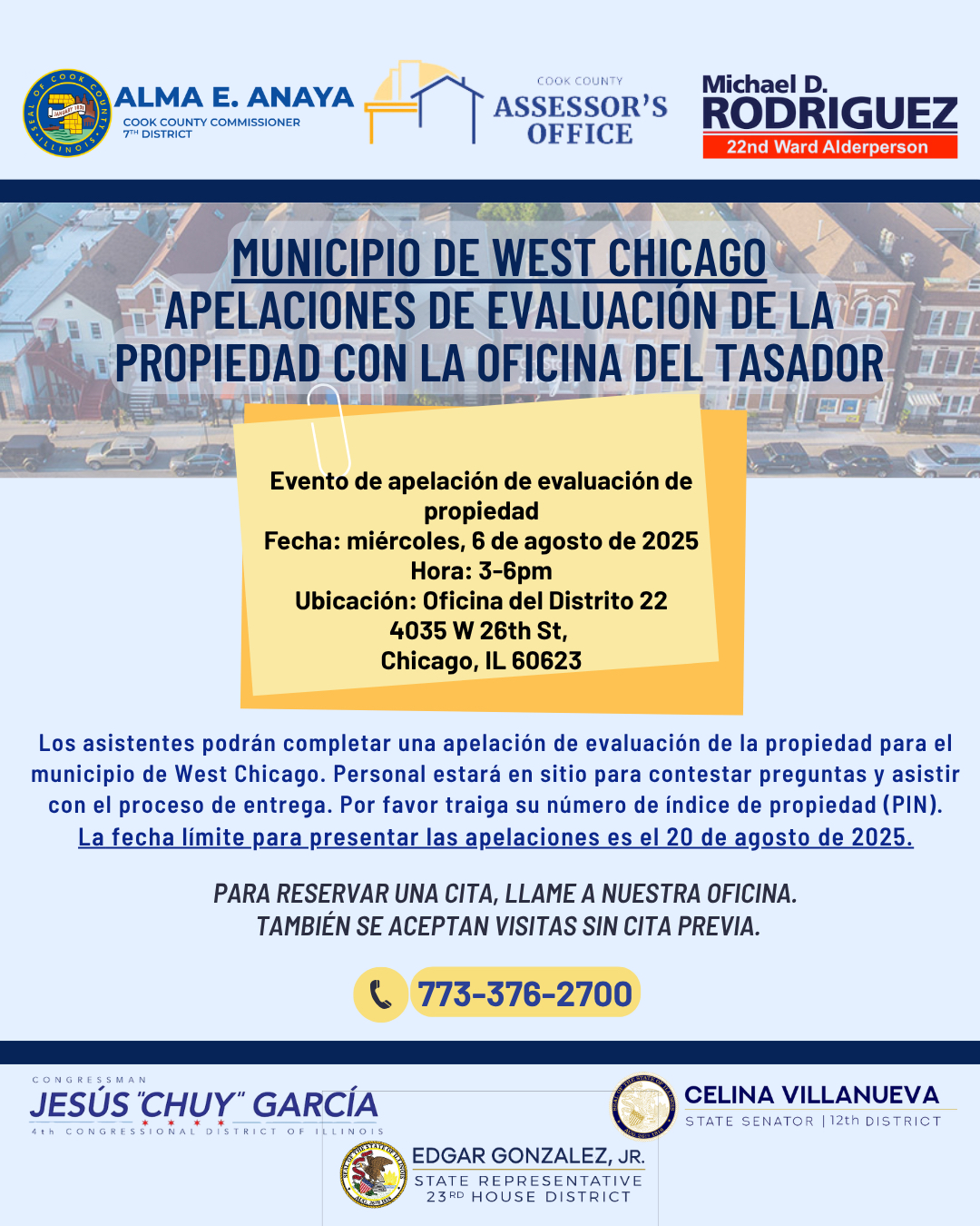 Reúnase personalmente con un representante de la Oficina del Asesor del Condado de Cook para aprender sobre las apelaciones en el Municipio de West Chicago.