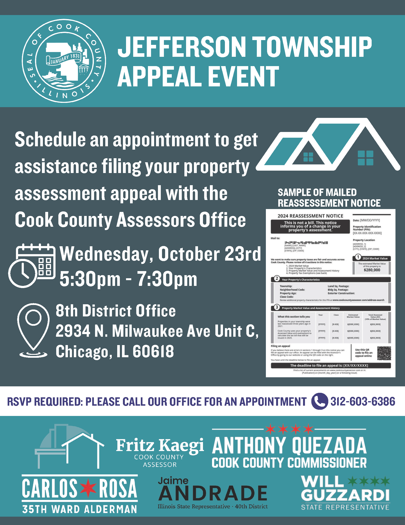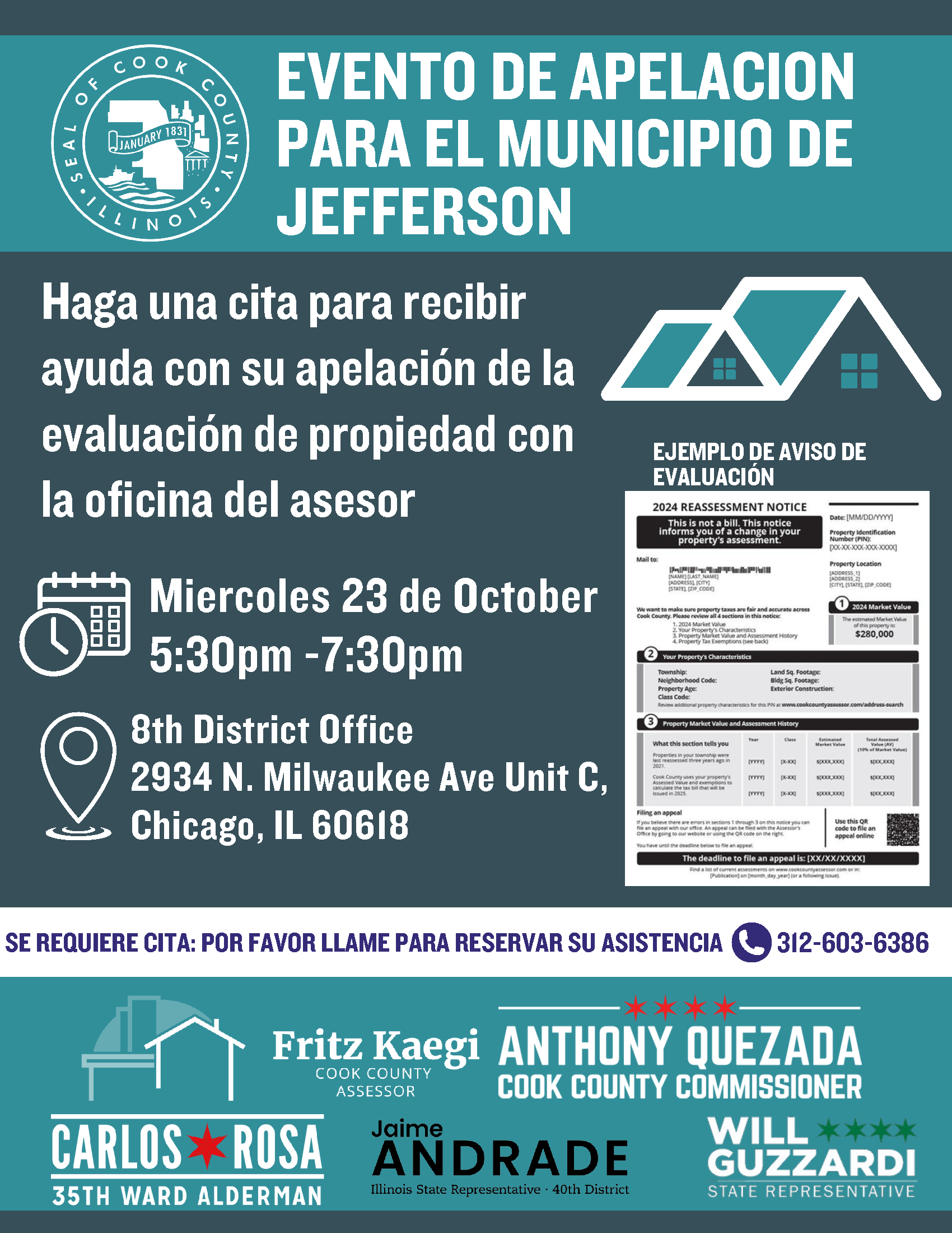 Reúnase personalmente con un representante de la Oficina del Asesor del Condado de Cook para aprender sobre reevaluaciones en Jefferson.