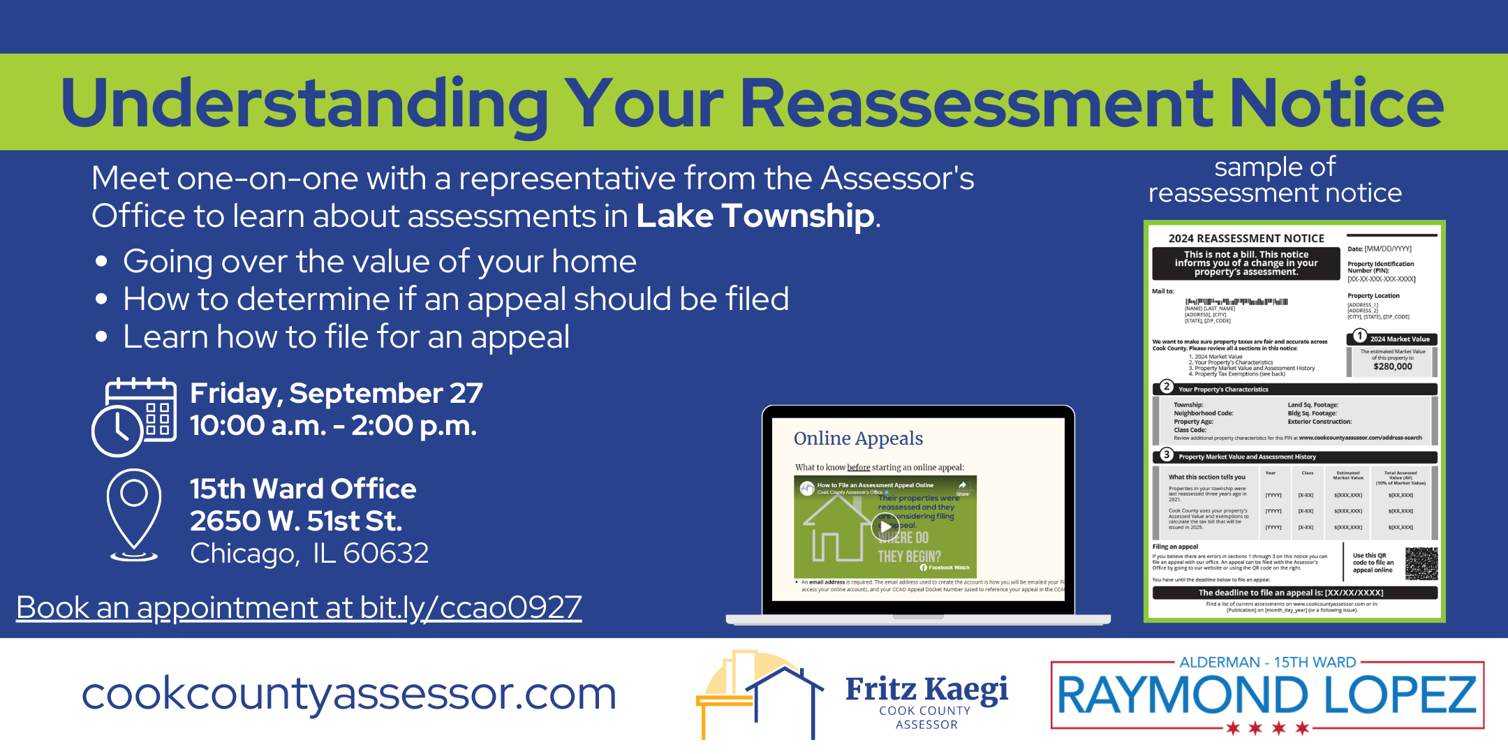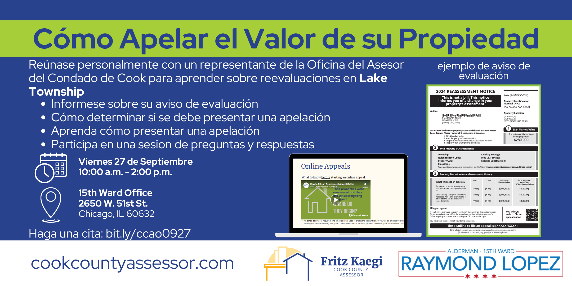 Reúnase personalmente con un representante de la Oficina del Asesor del Condado de Cook para aprender sobre reevaluaciones en .