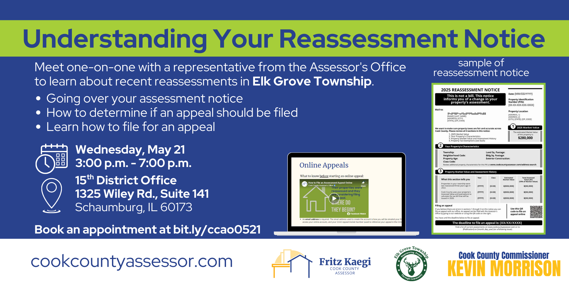 Meet one-on-one with a representative from the Assessor's Office to learn about recent reassessments in Elk Grove Township.