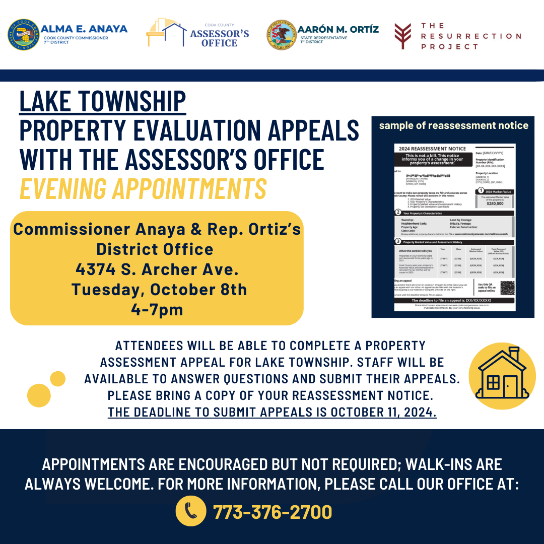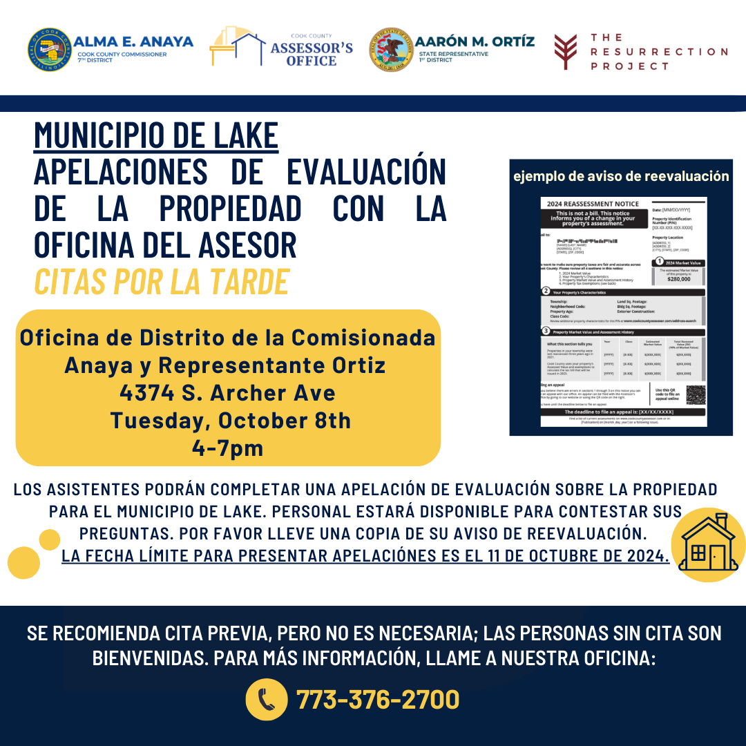 Reúnase personalmente con un representante de la Oficina del Asesor del Condado de Cook para aprender sobre reevaluaciones en Lake Township.