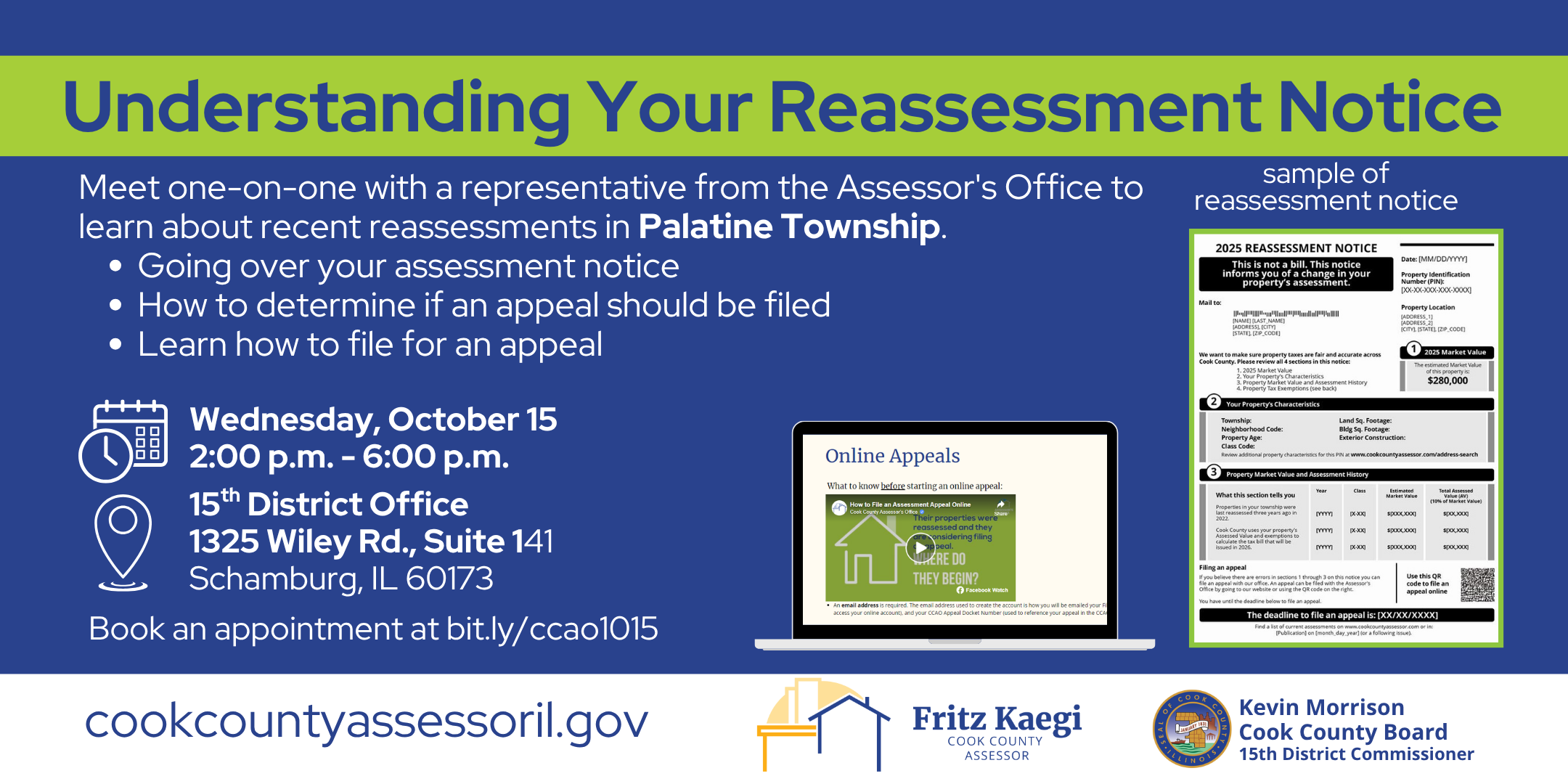 Meet one-on-one with a representative from the Assessor's Office to learn about recent reassessments in Palatine Township.