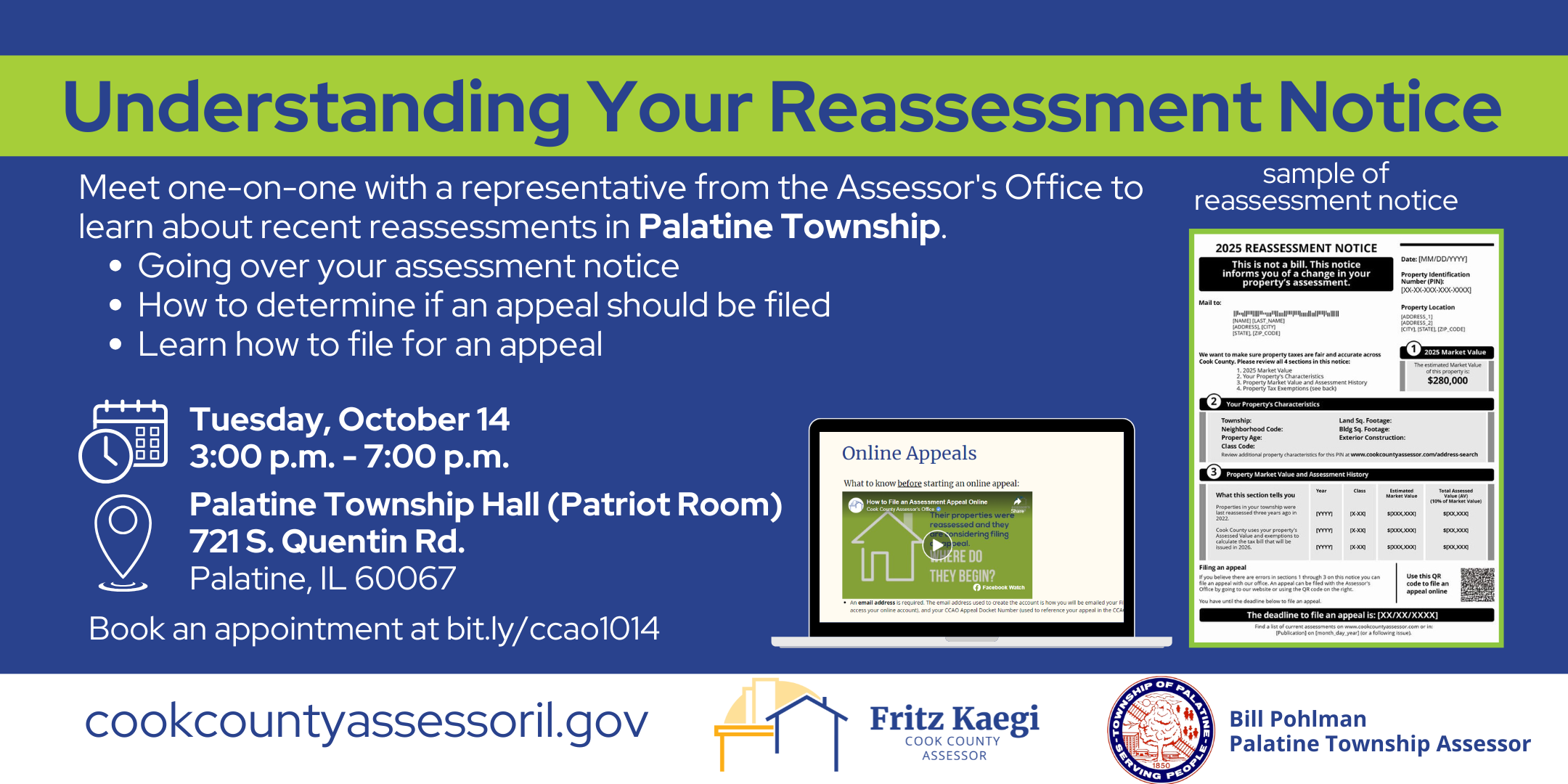 Meet one-on-one with a representative from the Assessor's Office to learn about recent reassessments in Palatine Township.