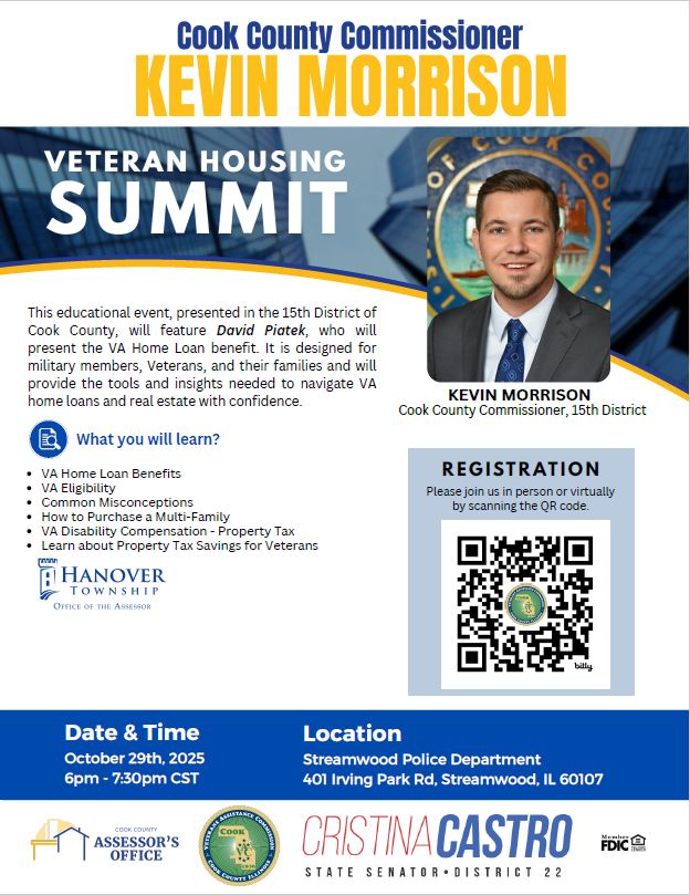 Please stop by our table at the Veteran Housing Summit to learn more about the Cook County Assessor's Office and about property tax saving exemptions available to veterans.