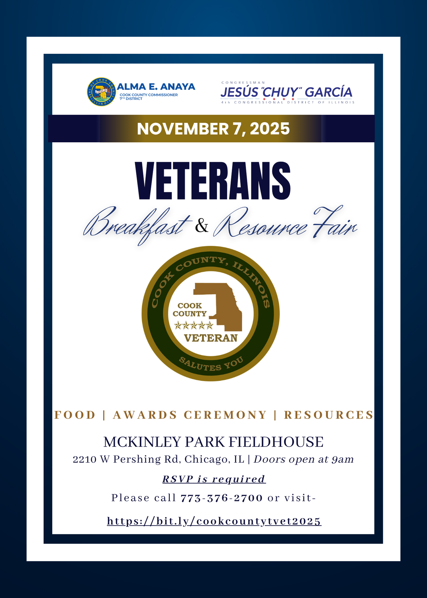Please stop by our table at the Veterans Breakfast and Resource Fair to learn more about the Cook County Assessor's Office and exemptions available to Veterans.