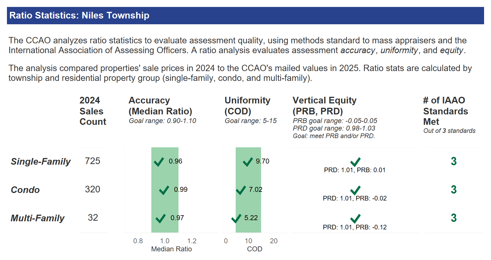 The Cook County Assessor's Office releases sales ratio statistics showing how its assessments performed relative to actual sale prices.